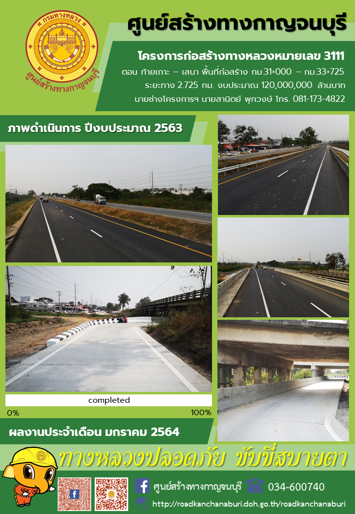 รายงานความคืบหน้าโครงการก่อสร้างทางหลวง มายเลข 3111 ตอนท้ายเกาะ-เสนา ระหว่าง กม.31+000 – กม.33+725 ประจำเดือนมกราคม 2564 ในปีงบประมาณ 2563