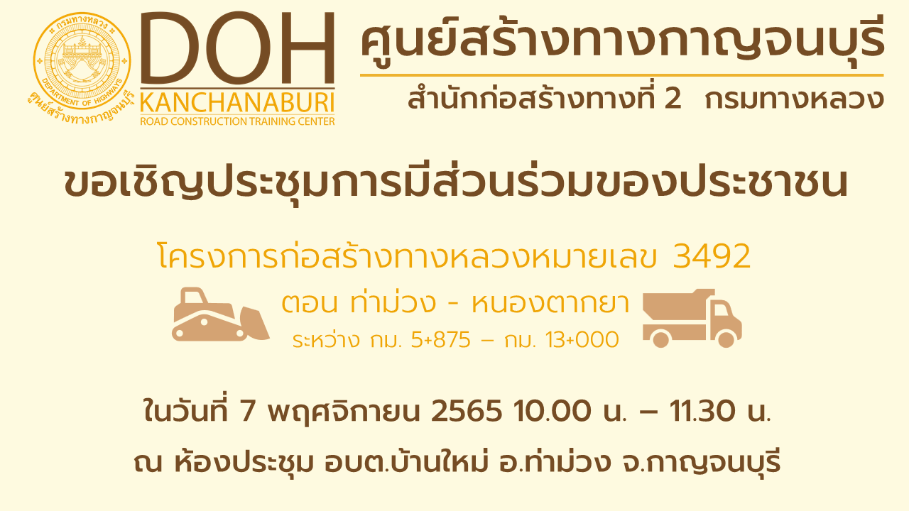 ขอเชิญเข้าร่วมประชุมการมีส่วนร่วมของประชาชน โครงการก่อสร้างทางหลวงหมายเลข 3492 ตอน ท่าม่วง-หนองตากยา วันที่ 7 พ.ย. 2565