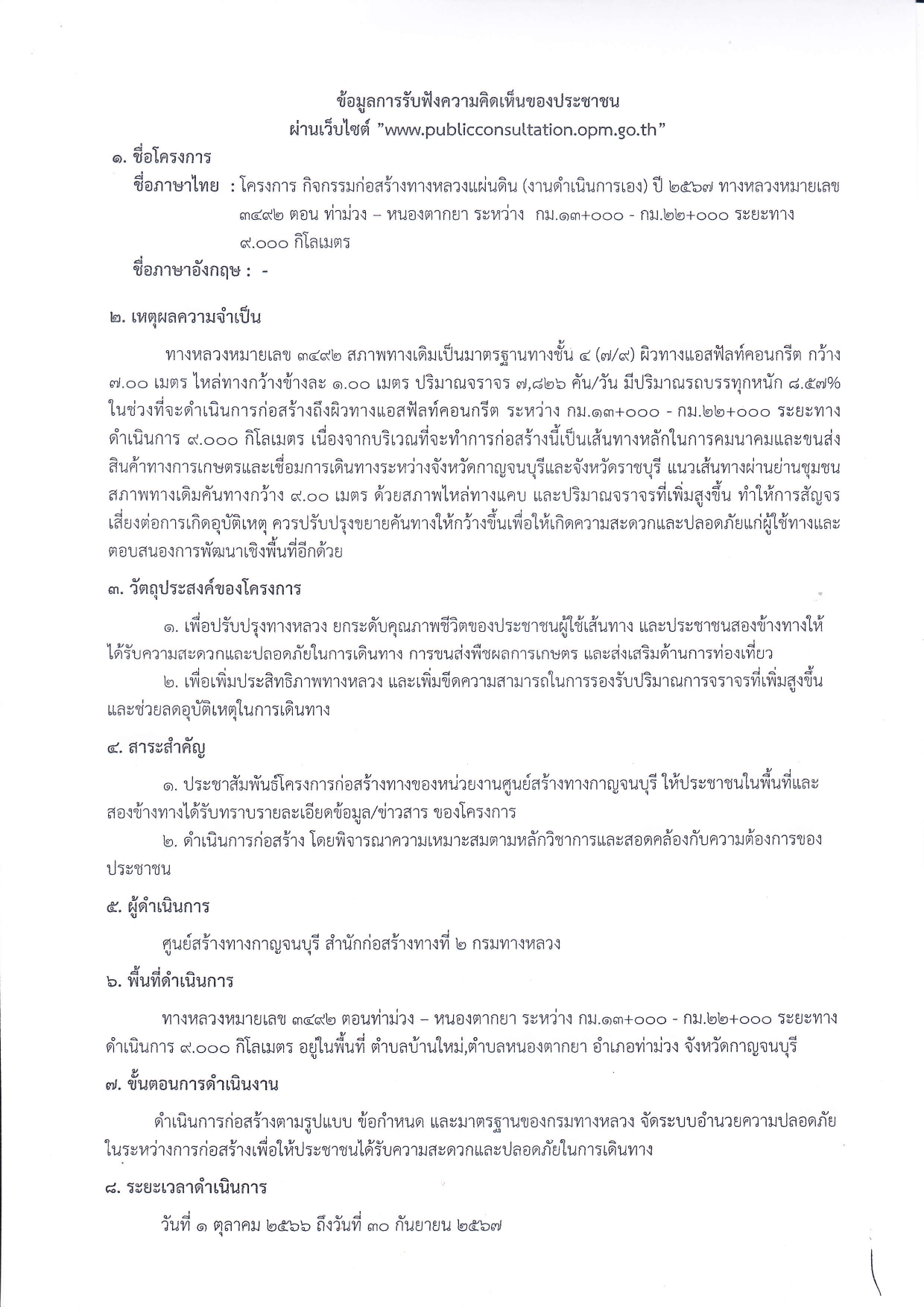 ข้อมูลการรับฟังความคิดเห็นของประชาชน ผ่าน "www.publicconsultation.opm.go.th โครงการกิจกรรมก่อสร้างทางหลวงแผ่นดิน (งานดำเนินการเอง) ปี ๒๕๖๗ ทางหลวงหมายเลข ๓๔๙๒ ตอน ท่าม่วง-หนองตากยา ระหว่าง กม.๑๓+๐๐๐-กม.๒๒+๐๐๐ ระยะทาง ๒.๐๐๐ กิโลเมตร