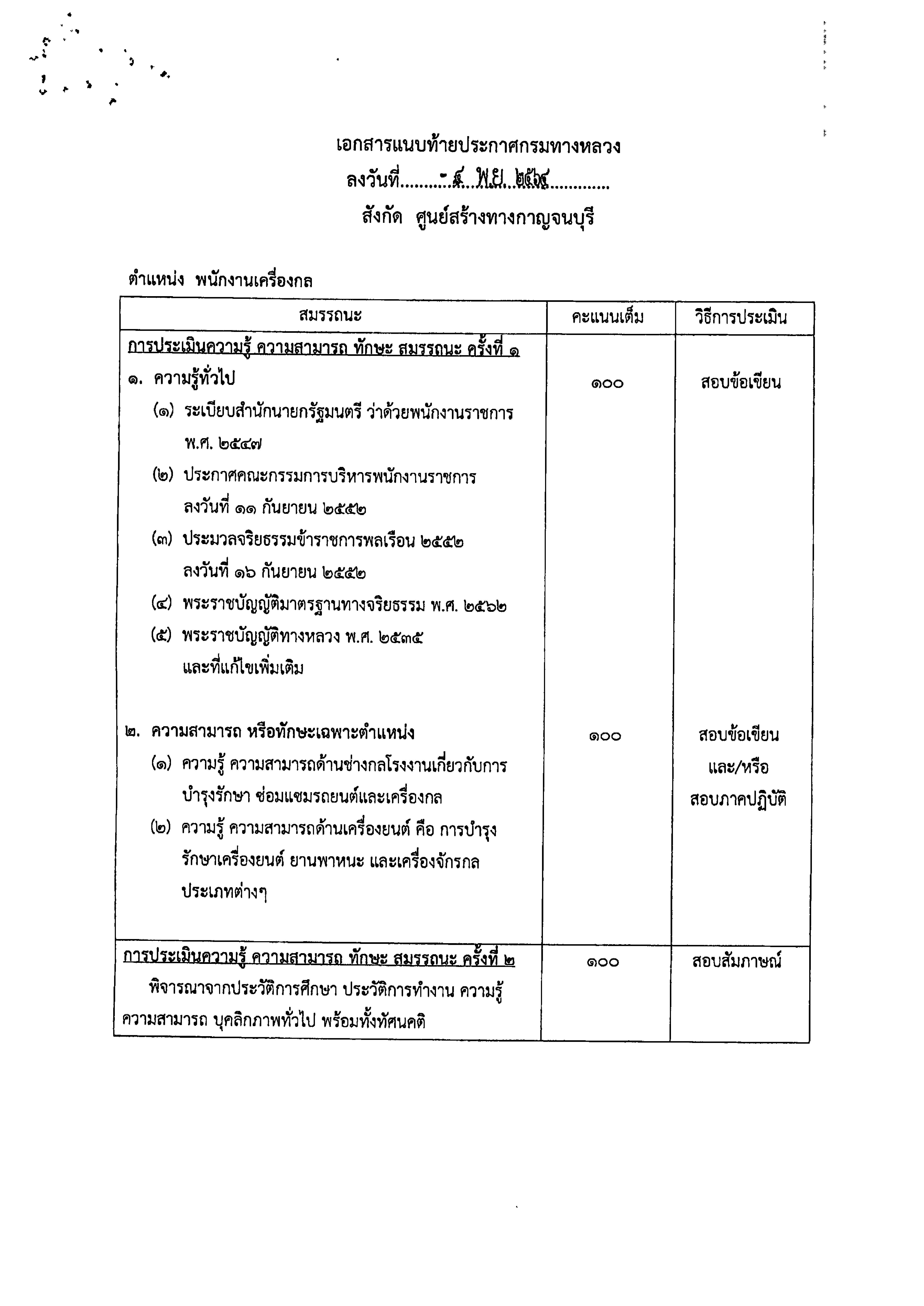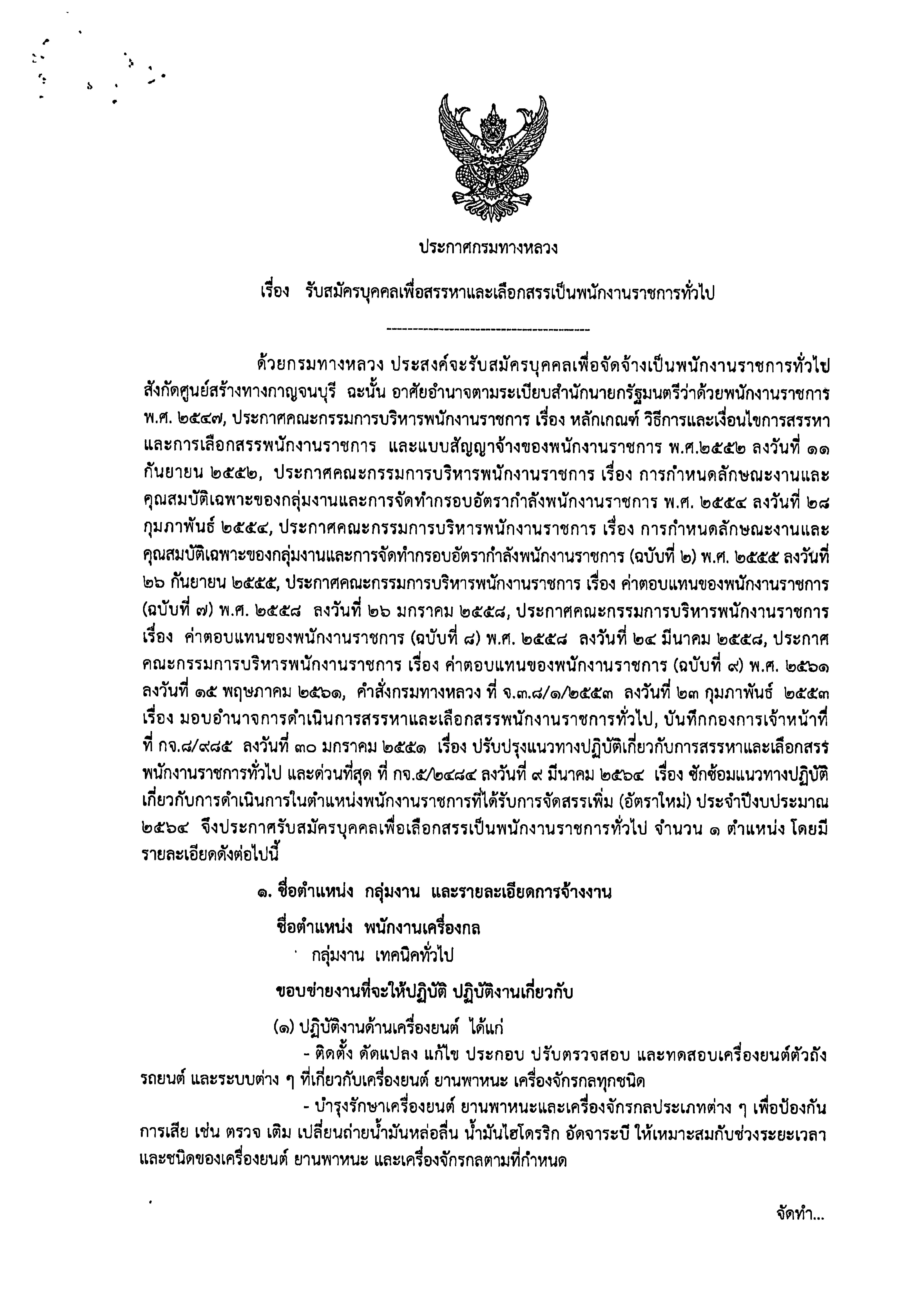 ศูนย์สร้างทางกาญจนบุรี รับสมัครพนักงานราชการ ตำแหน่ง พนักงานเครื่องกล 1 ตำแหน่ง