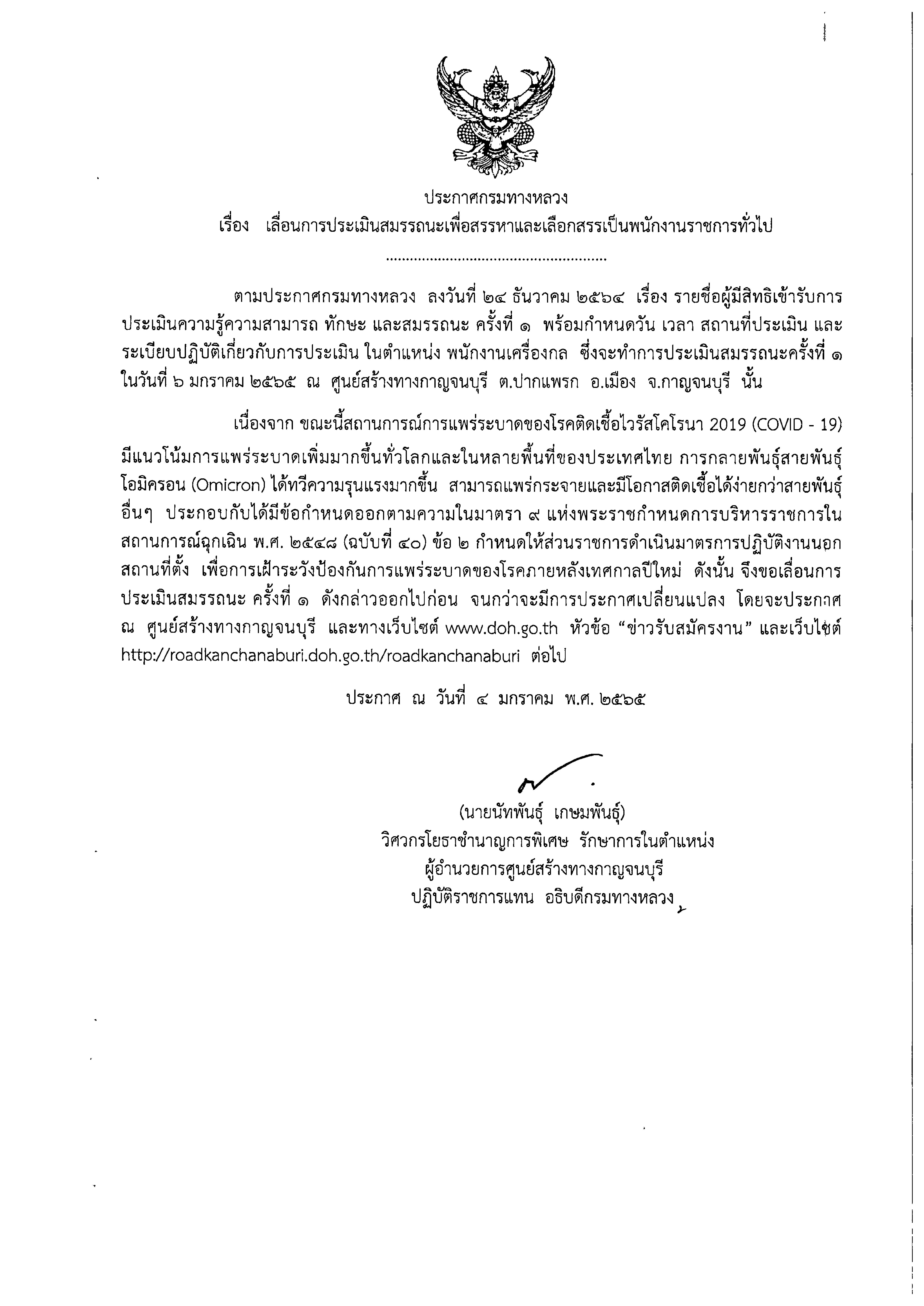 ประกาศ ศูนย์สร้างทางกาญจนบุรี เลื่อนการประเมินสมรรถนะเพื่อสรรหาและเลือกสรรเป็นพนักงานราชการทั่วไปในตำแหน่ง พนักงานเครื่องกล