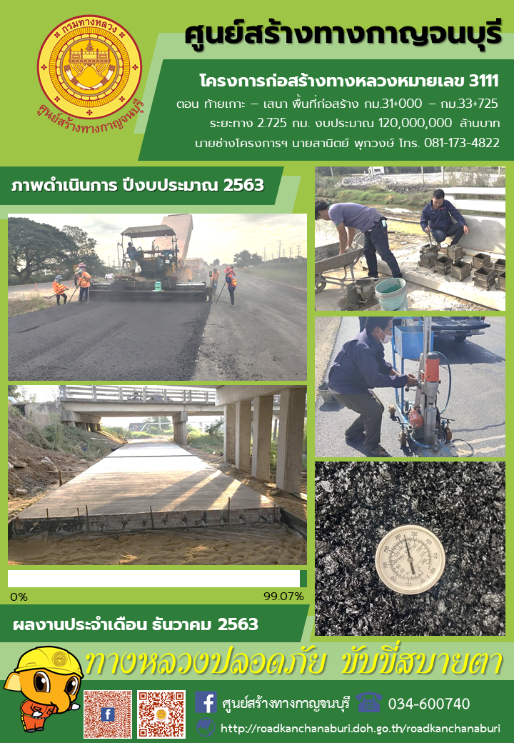 | ความคืบหน้า ประจำเดือนธันวาคม โครงการก่อสร้างทางหลวงหมายเลข 3111 ตอน ท้ายเกาะ – เสนา พื้นที่ก่อสร้าง กม.31+000 – กม.33+725 ระยะทาง 2.725 กม. งบประมาณ 120,000,000 ล้านบาท ประจำปีงบประมาณ2563 นายช่างโครงการฯ นายสานิตย์ พุกวงษ์ โทร. 081-173-4822 | 128 | ดาวน์โหลด |
