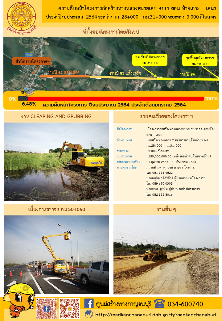 | ความคืบหน้าโครงการก่อสร้างทางหลวงหมายเลข 3111 ตอน ท้ายเกาะ – เสนา ในปีงบประมาณ 2564 ระหว่าง กม.28+000 – กม.31+000 ระยะทาง 3.000 กิโลเมตร ก่อสร้างทางหลวง 2 ช่องจราจร (ด้านซ้ายทาง) งบประมาณ 150,000,000.00 (หนึ่งร้อยห้าสิบล้านบาทถ้วน) ประจำเดือนมกราคม 2564 นายช่างโครงการฯ นายสานิตย์ พุกวงษ์ | 136 | ดาวน์โหลด |