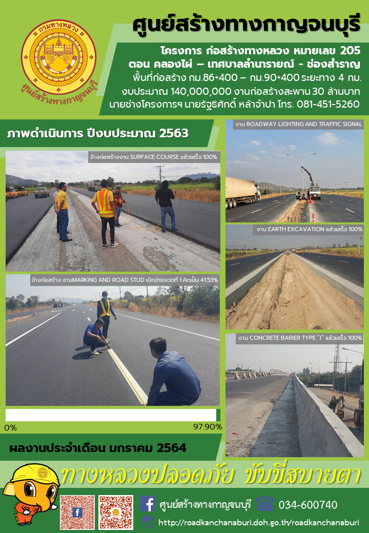 | ความคืบหน้าโครงการก่อสร้างทางหลวง หมายเลข 205 ตอน คลองไผ่ – เทศบาลลำนารายณ์ - ช่องสำราญ ในปีงบประมาณ 2563 ประจำเดือนมกราคม 2564 พื้นที่ก่อสร้าง กม.86+400 – กม.90+400 ระยะทาง 4 กม. งบประมาณ 140,000,000 งานก่อสร้างสะพาน 30 ล้านบาท นายช่างโครงการฯ นายรัฐธิศักดิ์ หล้าจำปา | 133 | ดาวน์โหลด |