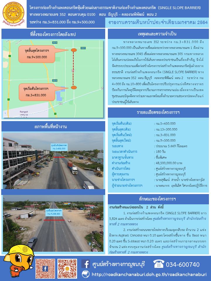 | ความคืบหน้าโครงการก่อสร้างกำแพงคอนกรีตหุ้มด้วยแผ่นยางธรรมชาติงานก่อสร้างกำแพงคอนกรีต (SINGLE SLOPE BARRIER) ทางหลวงหมายเลข 352 ตอนควบคุม 0100 ตอน ธัญบุรี – คลองระพีพัฒน์ ตอน 2 ระหว่าง กม.3+831.000 ถึง กม.9+500.000 ในปีงบประมาณ 2564 ประจำเดือนมกราคม 2564 นายช่างโครงการ นายสุพัฒน์ สายน้ำ นายช่างโยธาอาวุโส | 127 | ดาวน์โหลด |