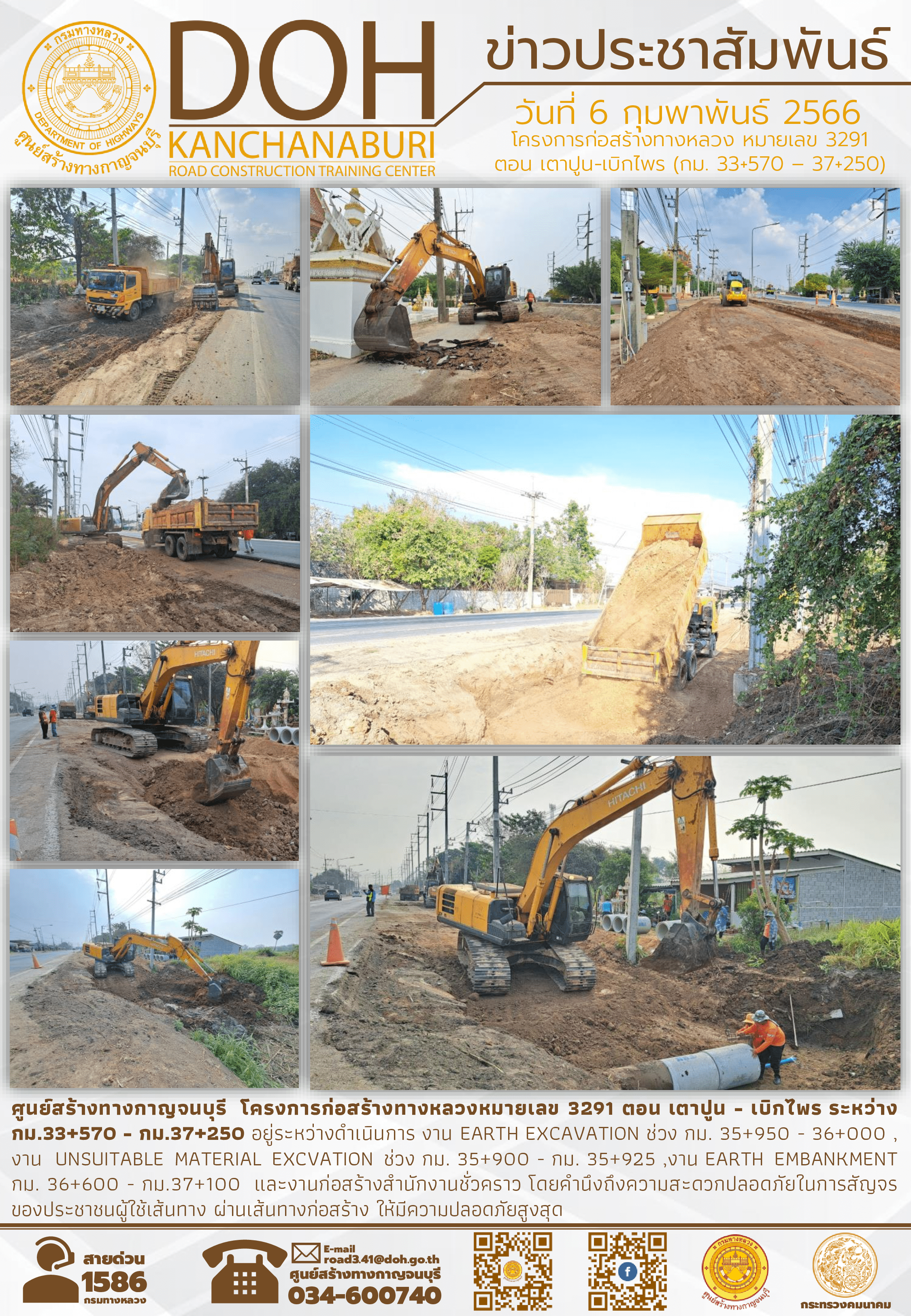 ศูนย์สร้างทางกาญจนบุรี  โครงการก่อสร้างทางหลวงหมายเลข 3291 ตอน เตาปูน - เบิกไพรระหว่าง กม.33+570 - กม.37+250 อยู่ระหว่างดำเนินการ งาน EARTH EXCAVATION ช่วง กม. 35+950 - 36+000, งาน  UNSUITABLE MATERIAL EXCVATION ช่วง กม. 35+900 - กม. 35+925,งาน EARTH EMBANKMENT กม. 36+600 - กม.37+100  และงานก่อสร้างสำนักงานชั่วคราวโดยคำนึงถึงความสะดวกปลอดภัยในการสัญจรของประชาชนผู้ใช้เส้นทาง ผ่านเส้นทางก่อสร้าง ให้มีความปลอดภัยสูงสุด
