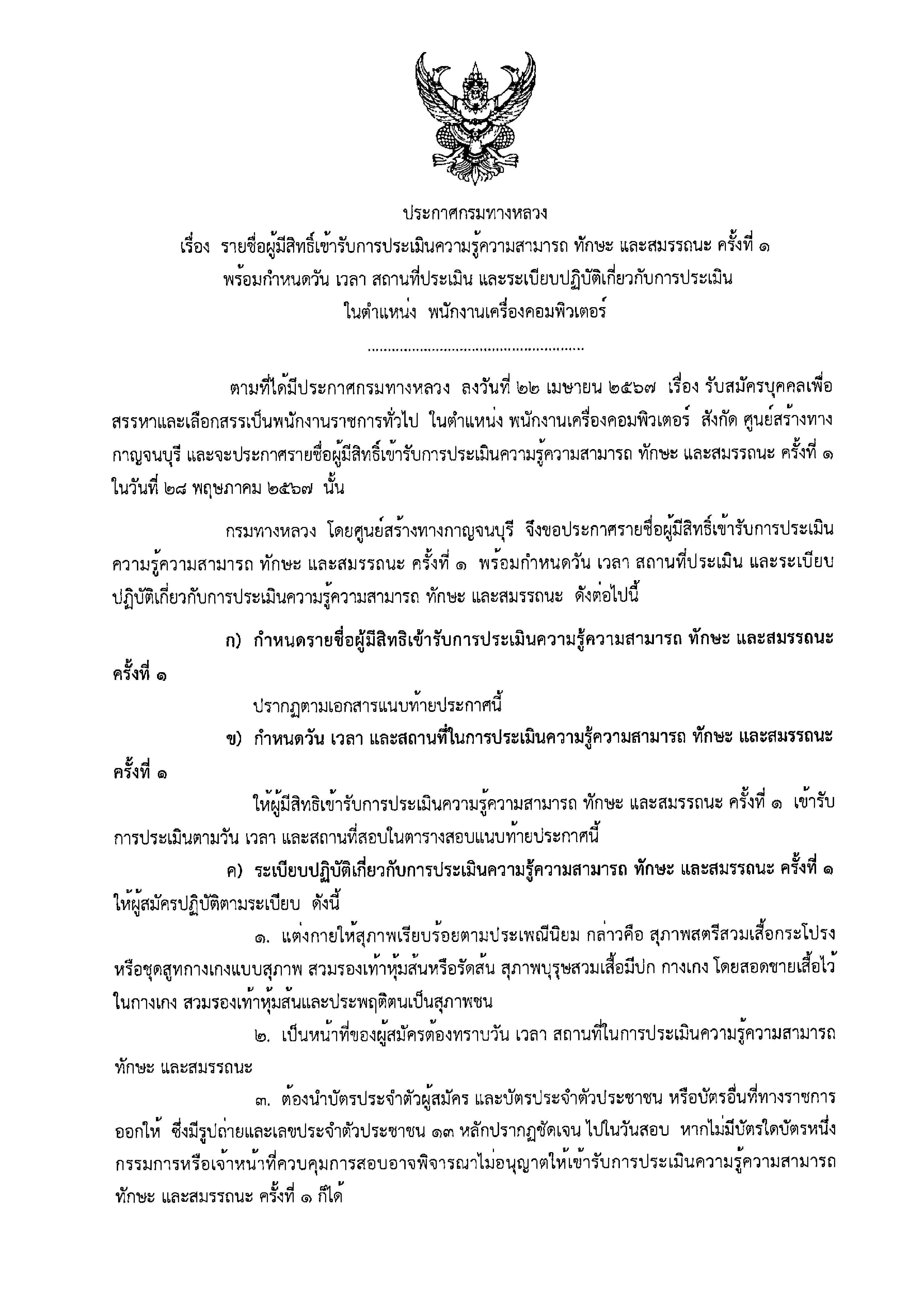 ประกาศรายชื่อผู้มีสิทธิ์เข้ารับการประเมินความรู้ ความสามารถ ทักษะและสมรรถนะ ครั้งที่ 1 ตำแหน่ง พนักงานเครื่องคอมพิวเตอร์