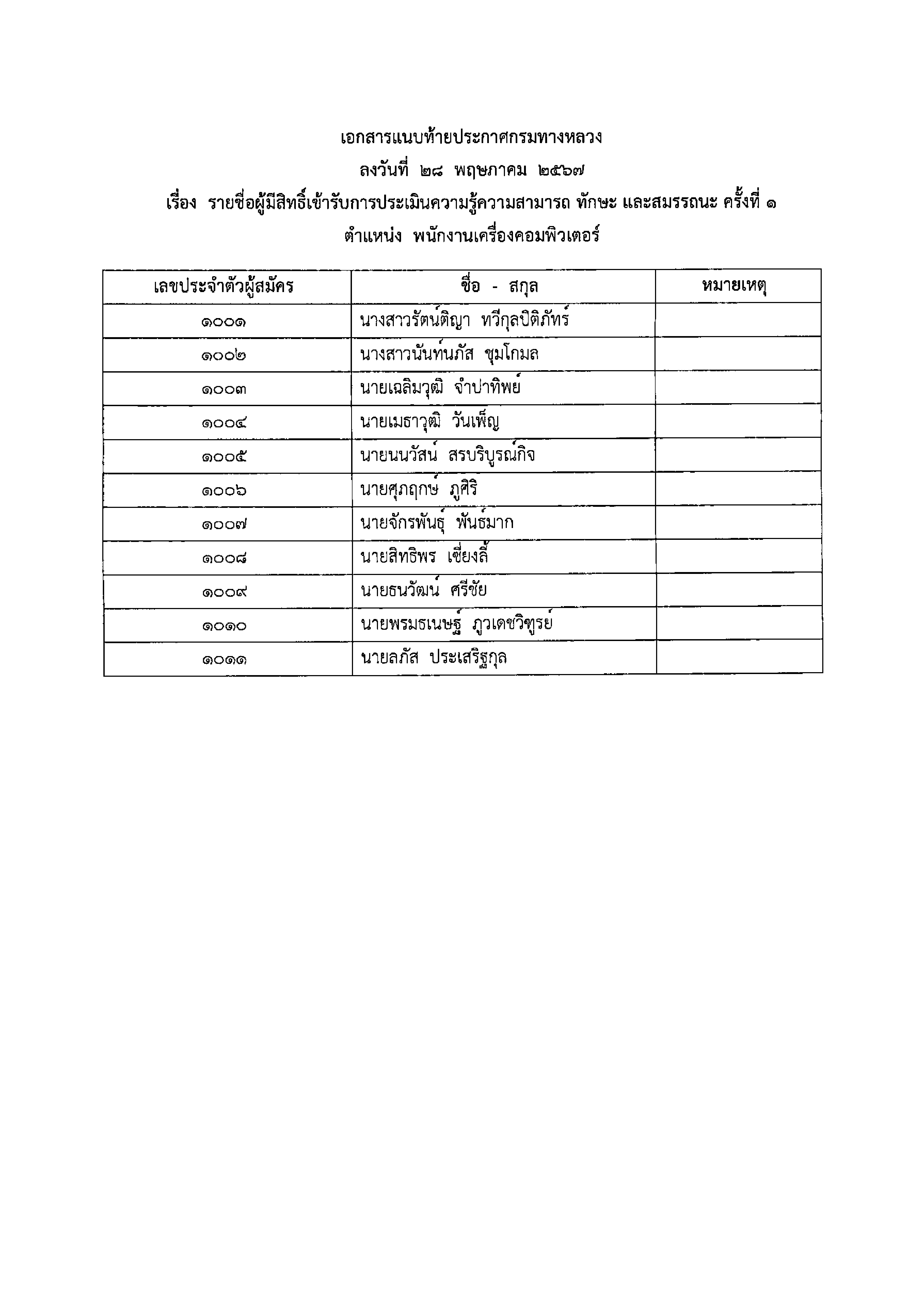 ประกาศรายชื่อผู้มีสิทธิ์เข้ารับการประเมินความรู้ความสามารถ