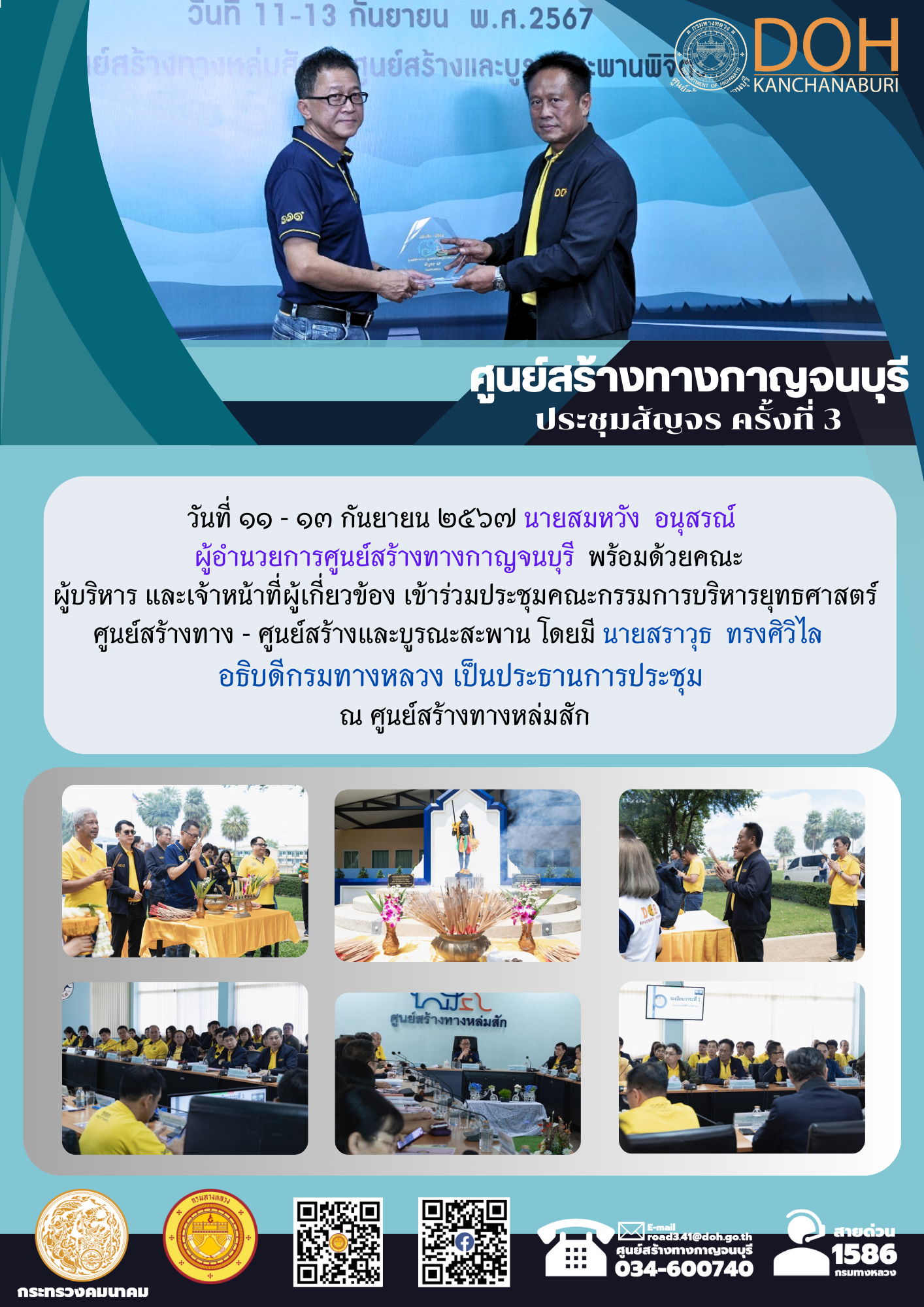 วันที่ ๑๑ - ๑๓ กันยายน ๒๕๖๗ นายสมหวัง อนุสรณ์ ผู้อำนวยการศูนย์สร้างทางกาญจนบุรี พร้อมด้วยคณะผู้บริหาร และเจ้าหน้าที่ผู้เกี่ยวข้อง เข้าร่วมประชุมคณะกรรมการบริหารยุทธศาสตร์ศูนย์สร้างทาง - ศูนย์สร้างและบูรณะสะพาน โดยมี นายสราวุธ ทรงศิวิไล อธิบดีกรมทางหลวง เป็นประธานการประชุม ณ ศูนย์สร้างทางหล่มสัก