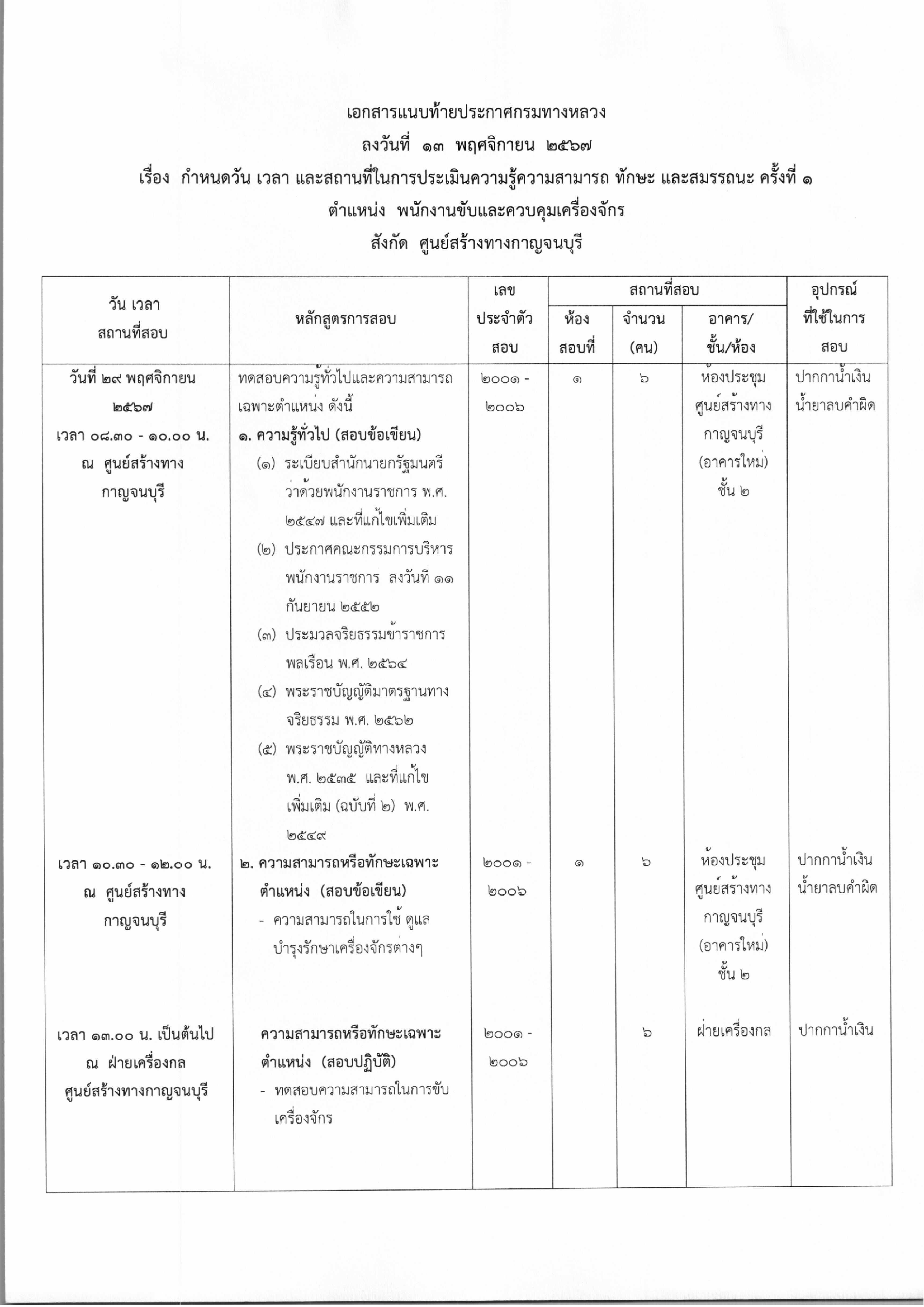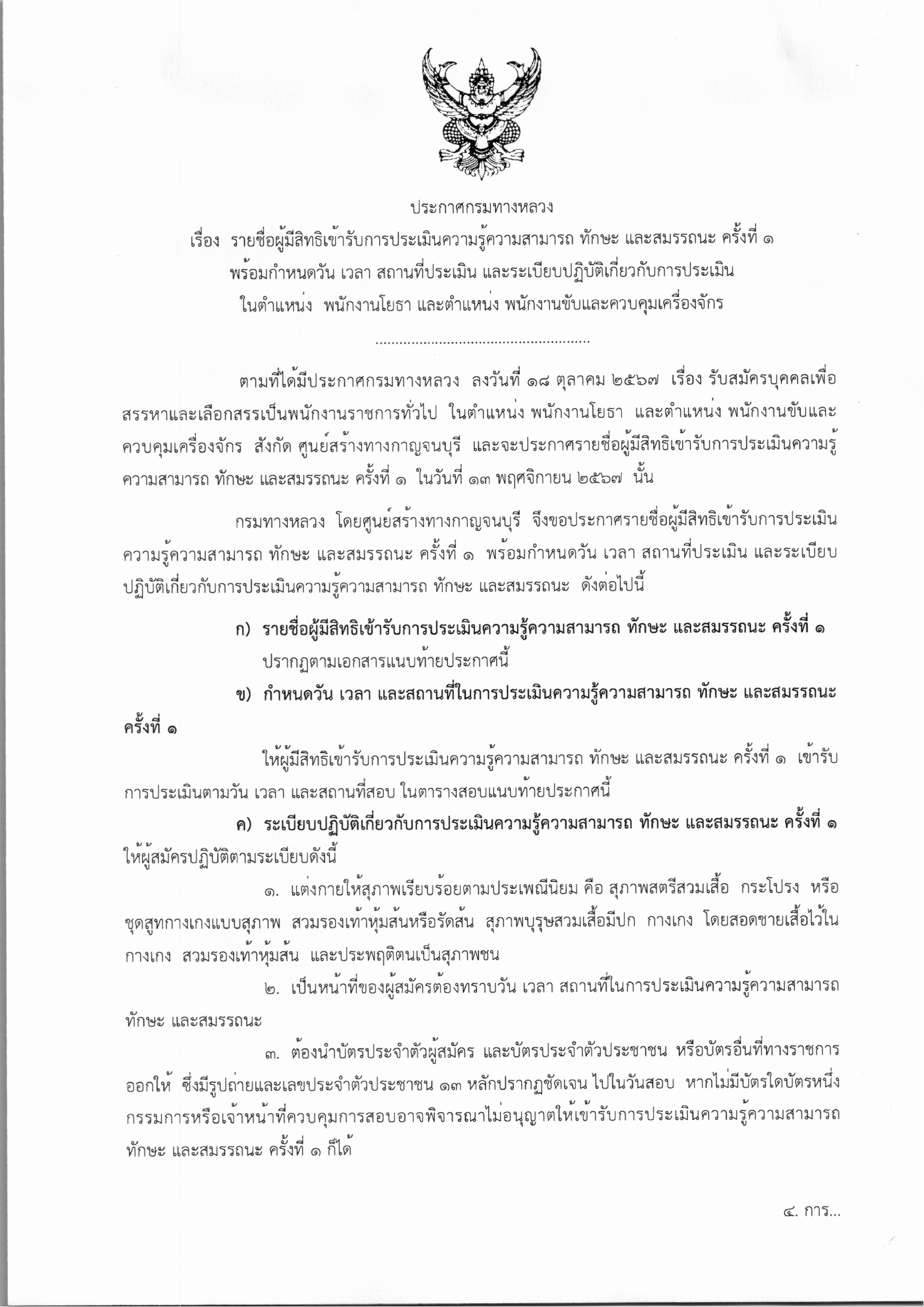 ประกาศรายชื่อผู้มีสิทธิเข้ารับการประเมินความรู้ความสามารถ ทักษะและสมรรถนะ ครั้งที่1 และกำหนดวันเวลา สถานที่ในการประเมิน ในตำแหน่ง พนักงานโยธา และ พนักงานขับและควบคุมเครื่องจักร