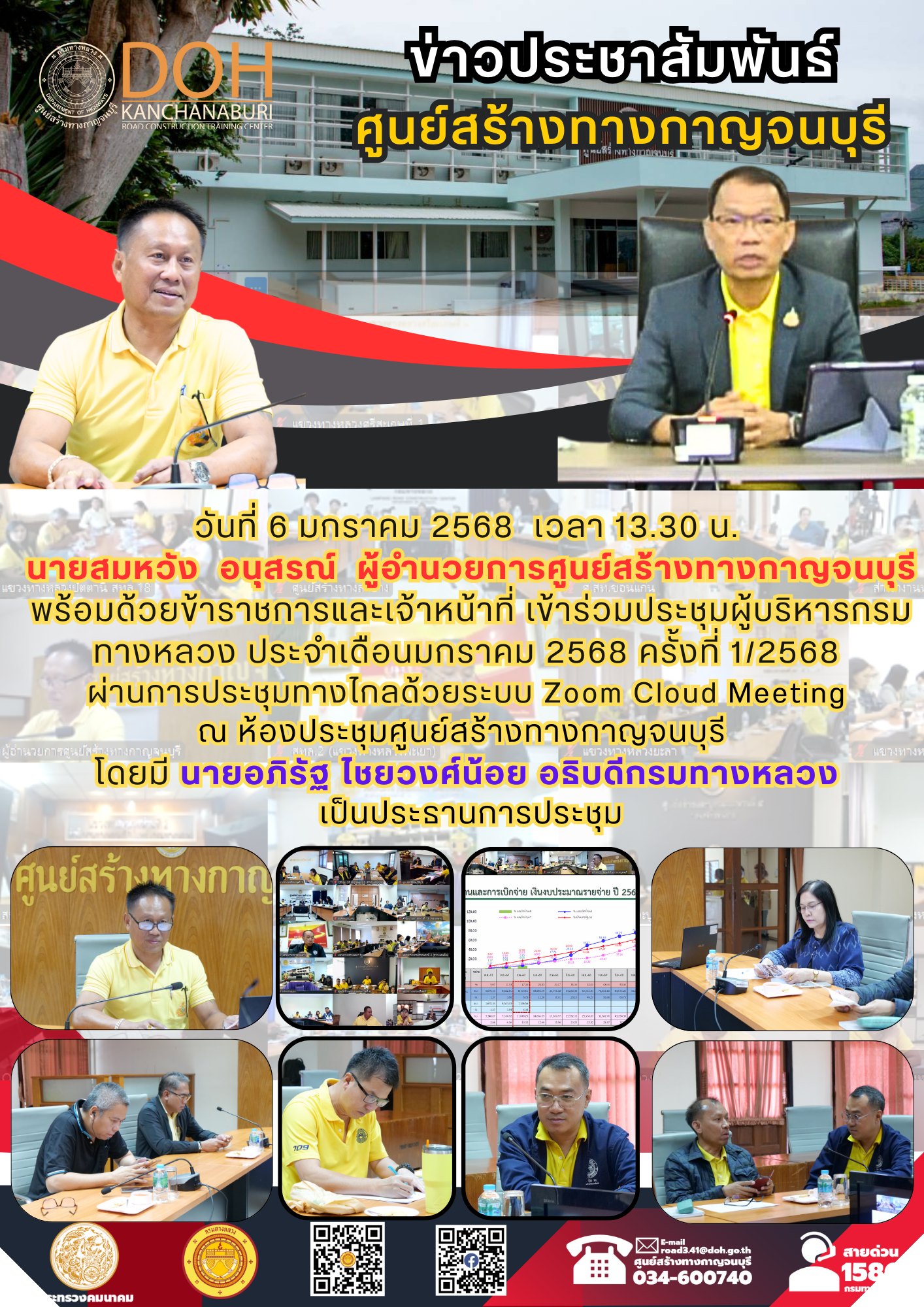 วันที่ 6 มกราคม 2568 เวลา 13.30 น. นายสมหวัง อนุสรณ์ ผู้อำนวยการศูนย์สร้างทางกาญจนบุรี พร้อมด้วยข้าราชการและเจ้าหน้าที่ เข้าร่วมประชุมผู้บริหารกรมทางหลวง ประจำเดือนมกราคม 2568 ครั้งที่ 1/2568 ผ่านการประชุมทางไกลด้วยระบบ Zoom Cloud Meeting ณ ห้องประชุมศูนย์สร้างทางกาญจนบุรี