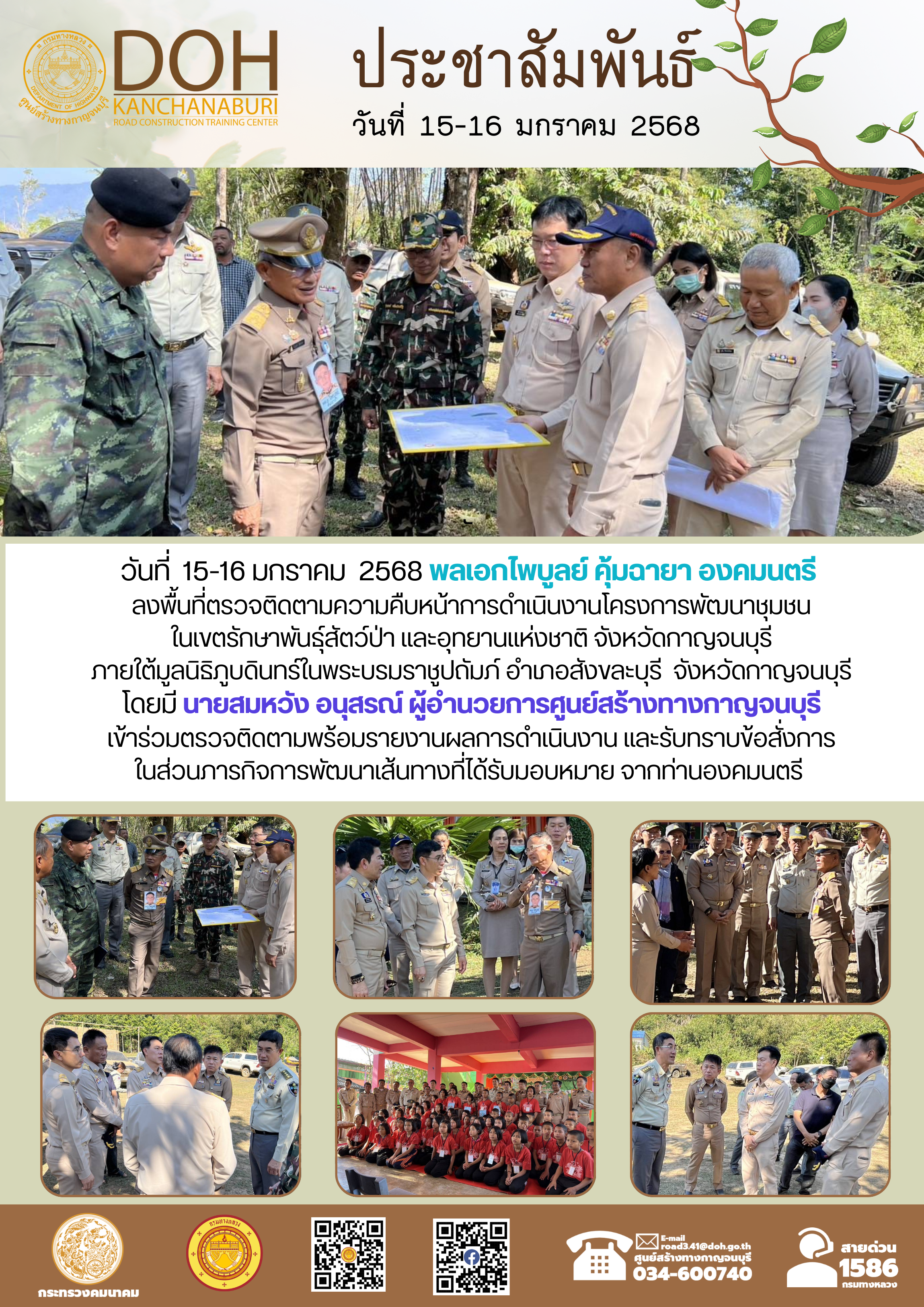 ข้อมูลข่าว : วันที่ 15-16 มกราคม 2568 พลเอกไพบูลย์ คุ้มฉายา องคมนตรี ลงพื้นที่ตรวจติดตามความคืบหน้าการดำเนินงานโครงการพัฒนาชุมชนในเขตรักษาพันธุ์สัตว์ป่า และอุทยานแห่งชาติ จังหวัดกาญจนบุรี ภายใต้มูลนิธิภูบดินทร์ในพระบรมราชูปถัมภ์ อำเภอสังขละบุรี จังหวัดกาญจนบุรี โดยมี นายสมหวัง อนุสรณ์ ผู้อำนวยการศูนย์สร้างทางกาญจนบุรี เข้าร่วมตรวจติดตามพร้อมรายงานผลการดำเนินงาน และรับทราบข้อสั่งการในส่วนภารกิจการพัฒนาเส้นทางที่ได้รับมอบหมาย จากท่านองคมนตรี