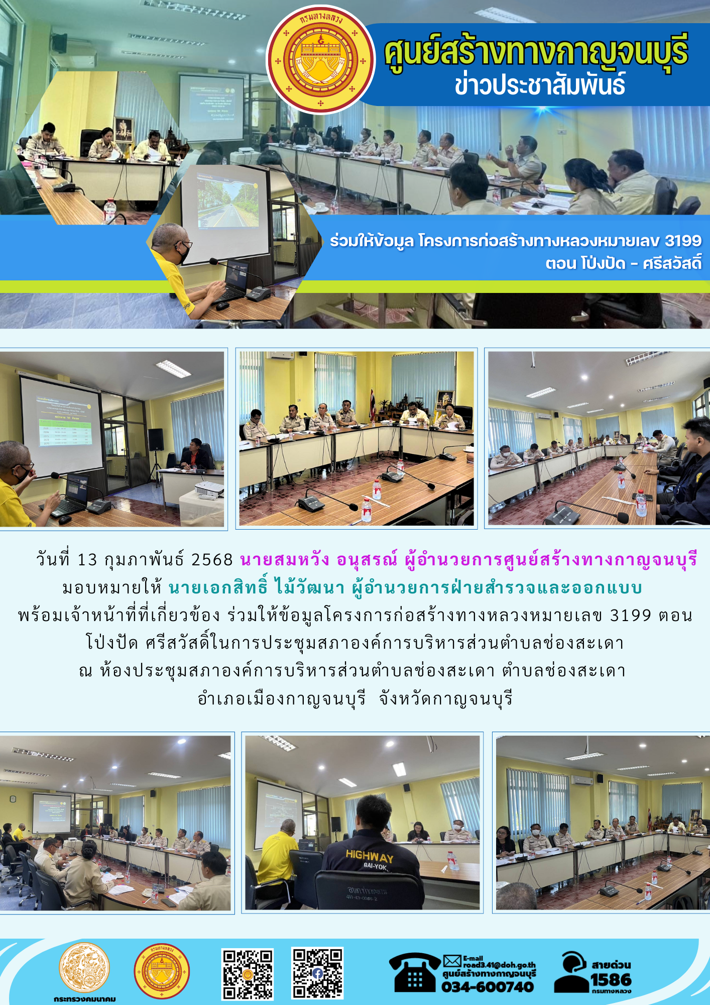 วันที่ 13 กุมภาพันธ์ 2568 นายสมหวัง อนุสรณ์ ผู้อำนวยการศูนย์สร้างทางกาญจนบุรี มอบหมายให้ นายเอกสิทธิ์ ไม้วัฒนา ผู้อำนวยการฝ่ายสำรวจและออกแบบ พร้อมเจ้าหน้าที่ที่เกี่ยวข้อง ร่วมให้ข้อมูลโครงการก่อสร้างทางหลวงหมายเลข 3199 ตอน โป่งปัด ศรีสวัสดิ์ ในการประชุมสภาองค์การบริหารส่วนตำบลช่องสะเดา ณ ห้องประชุมสภาองค์การบริหารส่วนตำบลช่องสะเดา ตำบลช่องสะเดา อำเภอเมืองกาญจนบุรี จังหวัดกาญจนบุรี