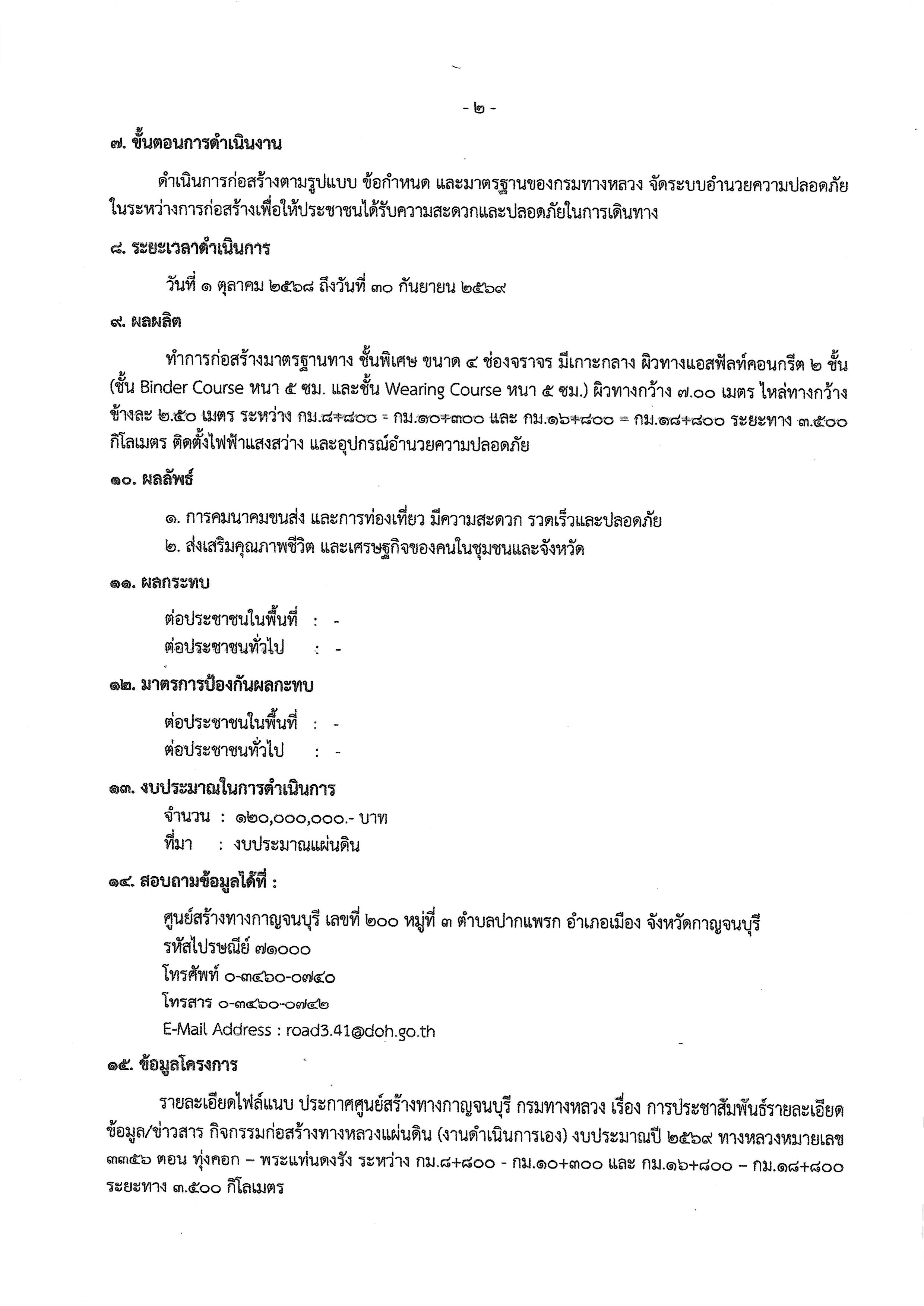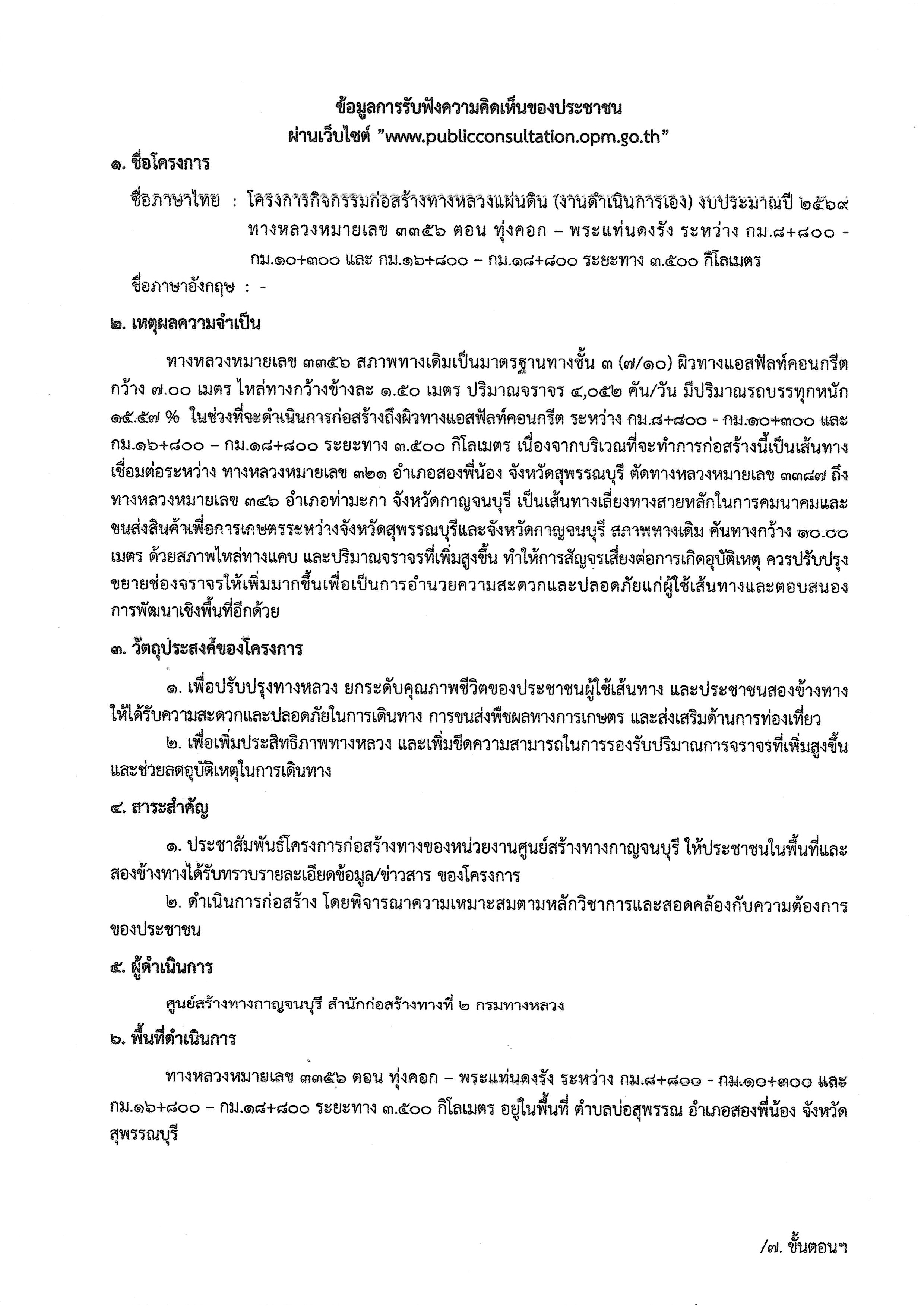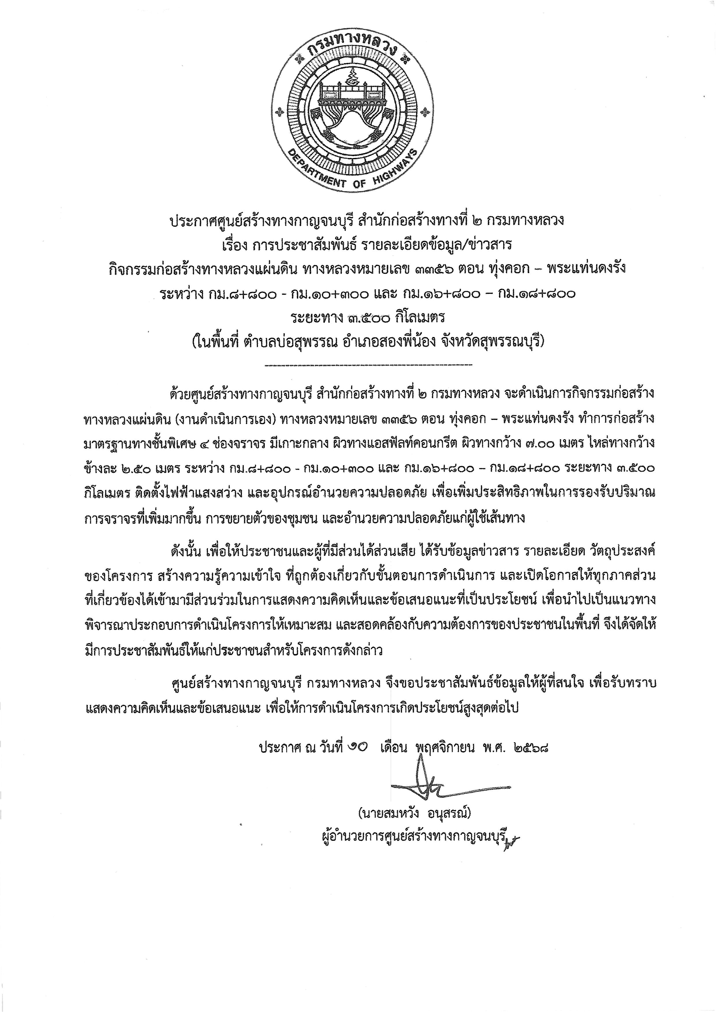 | การประชาสัมพันธ์ รายละเอียดข้อมูล/ข่าวสาร กิจกรรมก่อสร้างทางหลวงแผ่นดิน ทางหลวงหมายเลข 3356 ตอน ทุ่งคอก - พระแท่นดงรัง ระหว่าง กม.8+800 - กม.10+300 และ กม.16+800 - กม.18+800 ระยะทาง 3.500 กิโลเมตร (ในพื้นที่ ตำบลบ่อสุพรรณ อำเภอสองพี่น้อง จังหวัดสุพรรณบุรี) | 0 | ดาวน์โหลด |