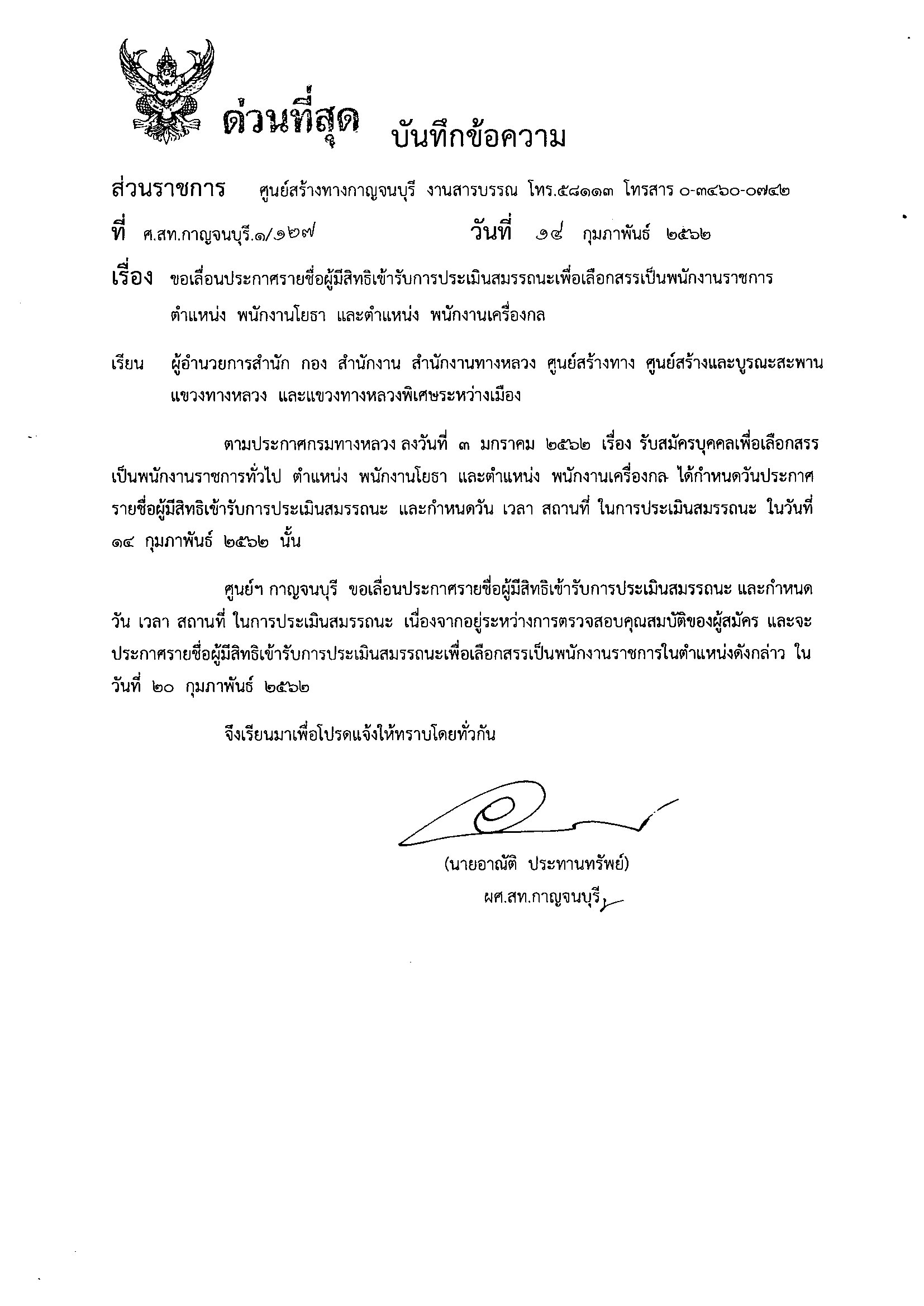 เลื่อนประกาศรายชื่อผู้มีสิทธิเข้ารับการประเมินสมรรถนะเพื่อเลือกสรรเป็นพนักงานราชการ