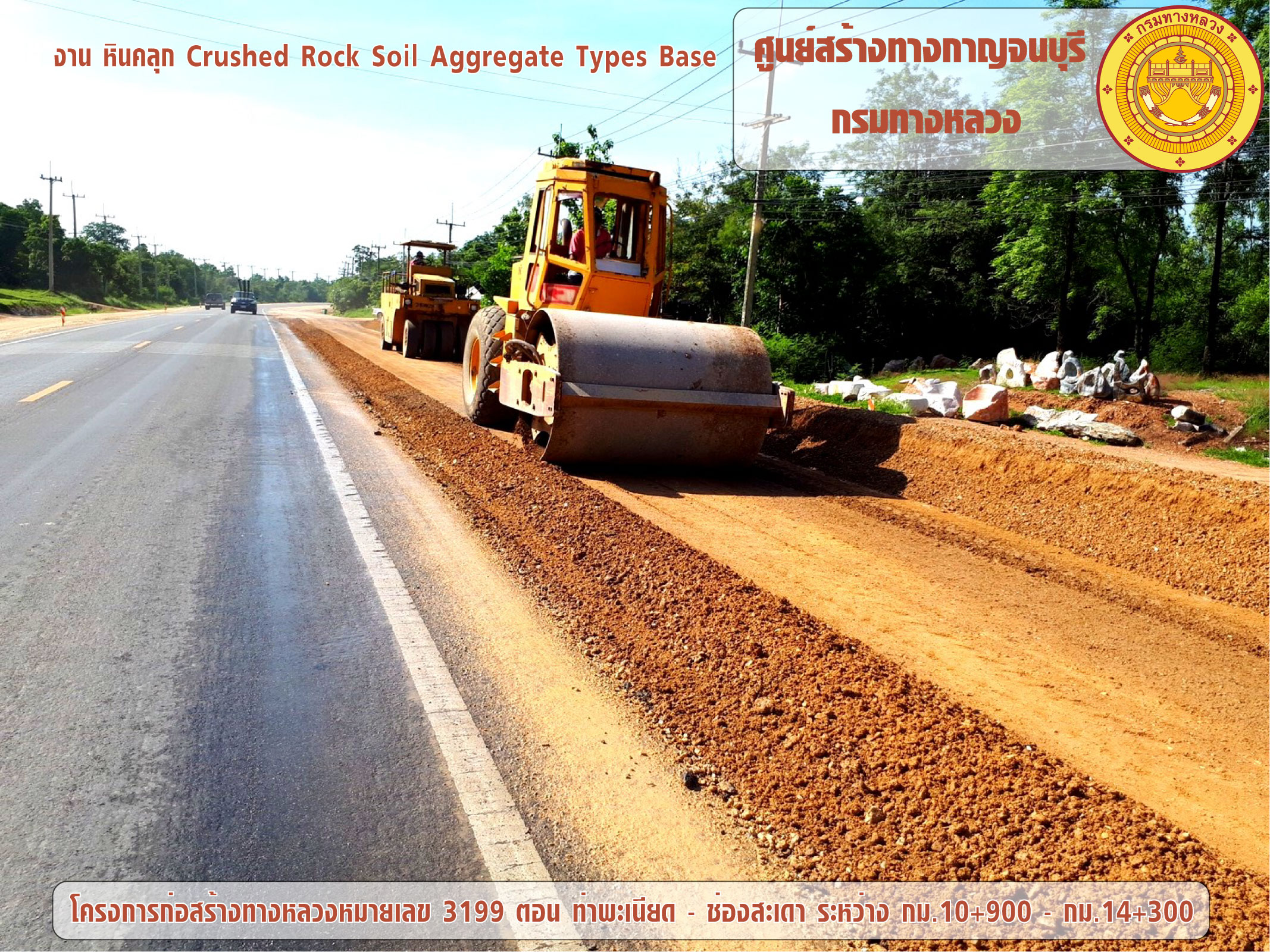 โครงการก่อสร้างทางหลวงหมายเลข 3199 ตอน ท่าพะเนียด - ช่องสะเดา ระหว่าง กม.10+900 - กม.14+300 ได้ดำเนินการก่อสร้างงานหินคลุก (Crushed Rock Soil Aggregate Types Base)