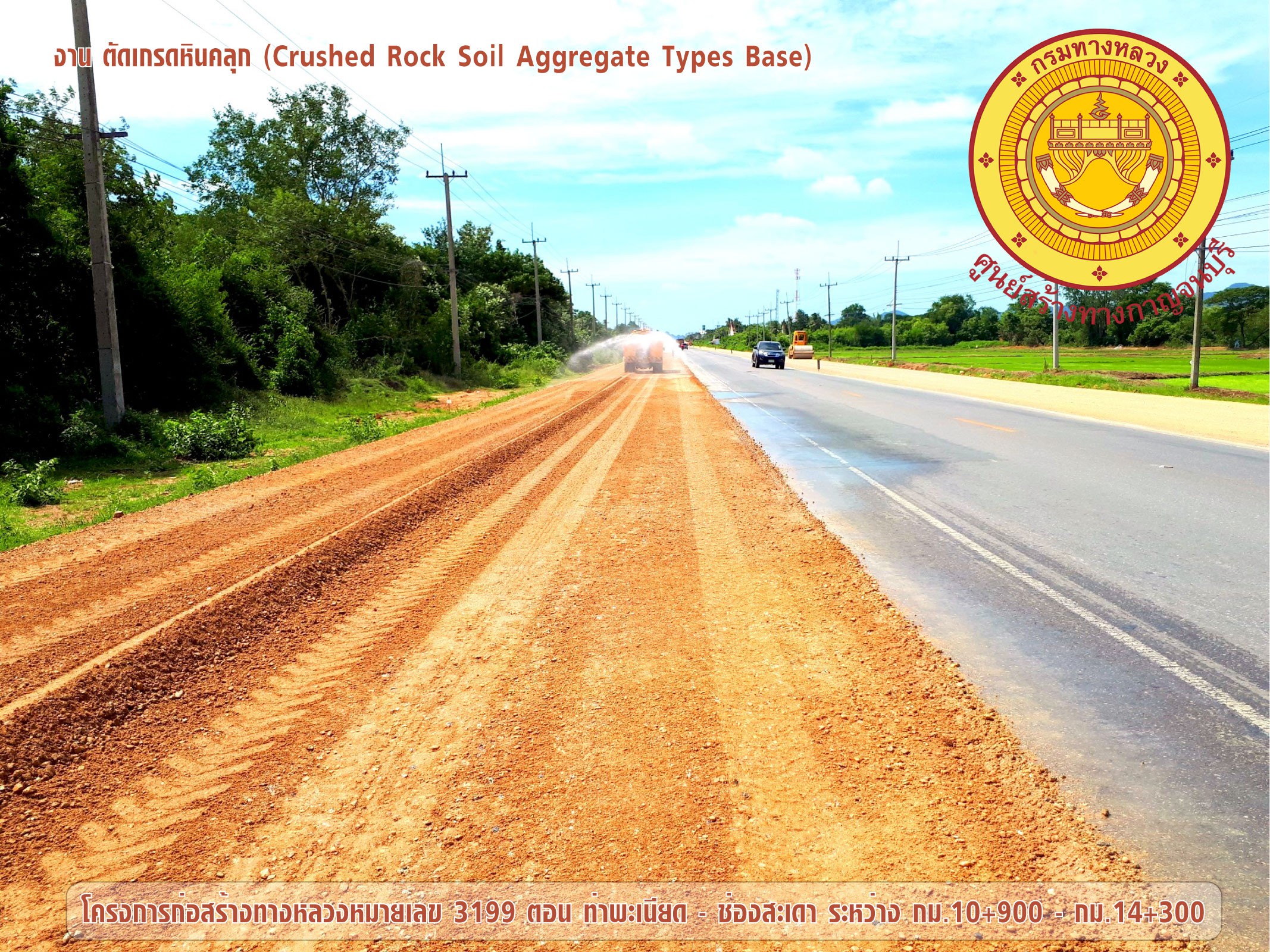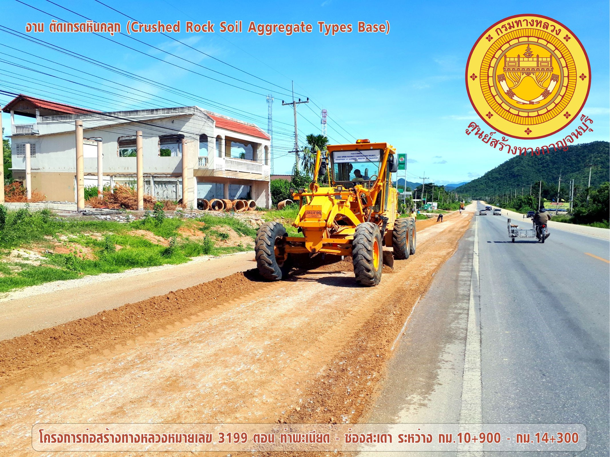 โครงการก่อสร้างทางหลวงหมายเลข 3199 ตอน ท่าพะเนียด - ช่องสะเดา ระหว่าง กม.10+900 - กม.14+300 ได้ดำเนินการตัดเกรดหินคลุก (Crushed Rock Soil Aggregate Types Base)