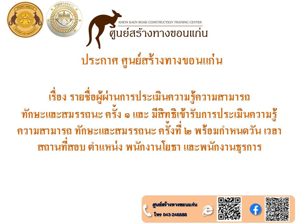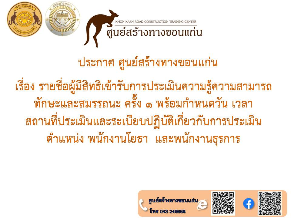 ประกาศศูนย์สร้างทางขอนแก่น ลงวันที่ ๒๖ พฤศจิกายน ๒๕๖๗ เรื่อง รายชื่อผู้มีสิทธิเข้ารับการประเมินสมรรถนะ กำหนดวัน เวลา สถานที่ ในการประเมินสมรรถนะ ครั้งที่ ๑