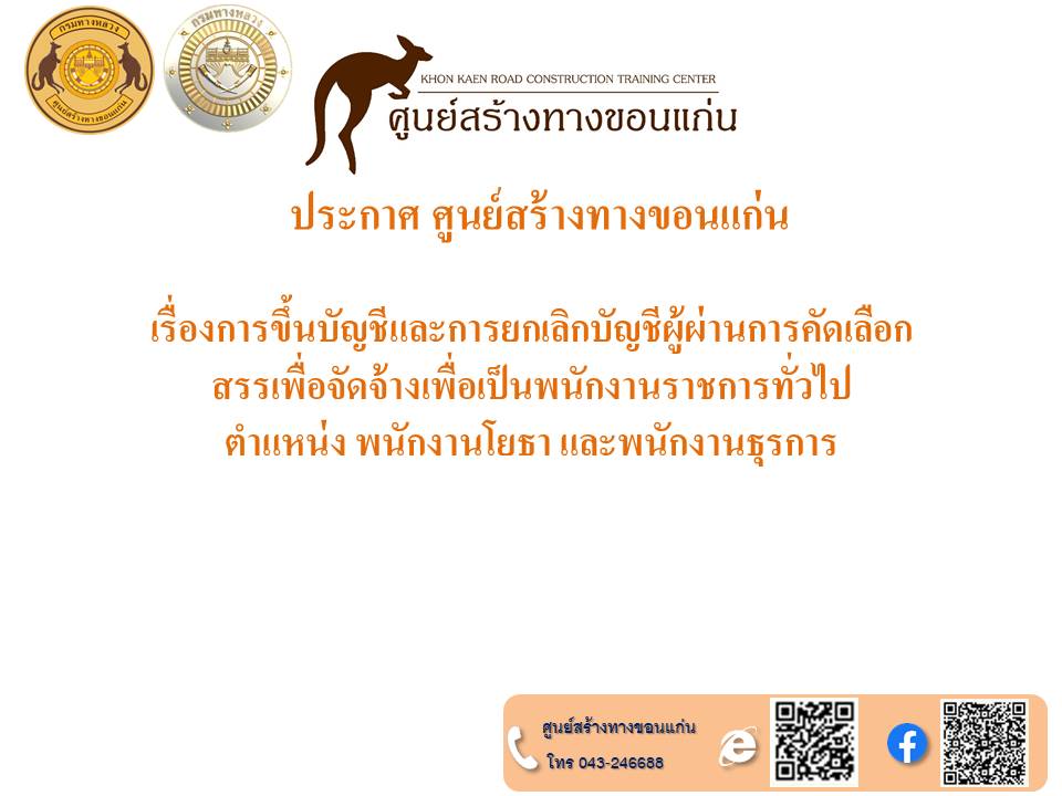 ประกาศศูนย์สร้างทางขอนแก่น วันที่ ๑๐ กันยายน ๒๕๖๗ เรื่อง การขึ้นบัญชีและการยกเลิกบัญชีผู้ผ่านการเลือกสรรเพื่อจัดจ้างเป็นพนักงานราชการทั่วไป ในตำแหน่งพนักงานโยธา และพนักงานธุรการ