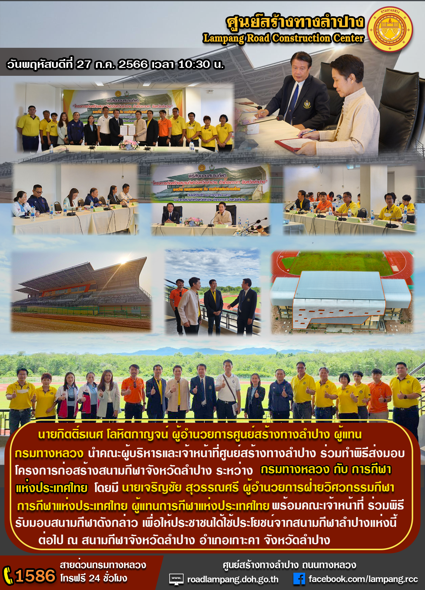 พิธีส่งมอบโครงการก่อสร้างสนามกีฬาจังหวัดลำปาง ระหว่าง กรมทางหลวง กับ การกีฬาแห่งประเทศไทย