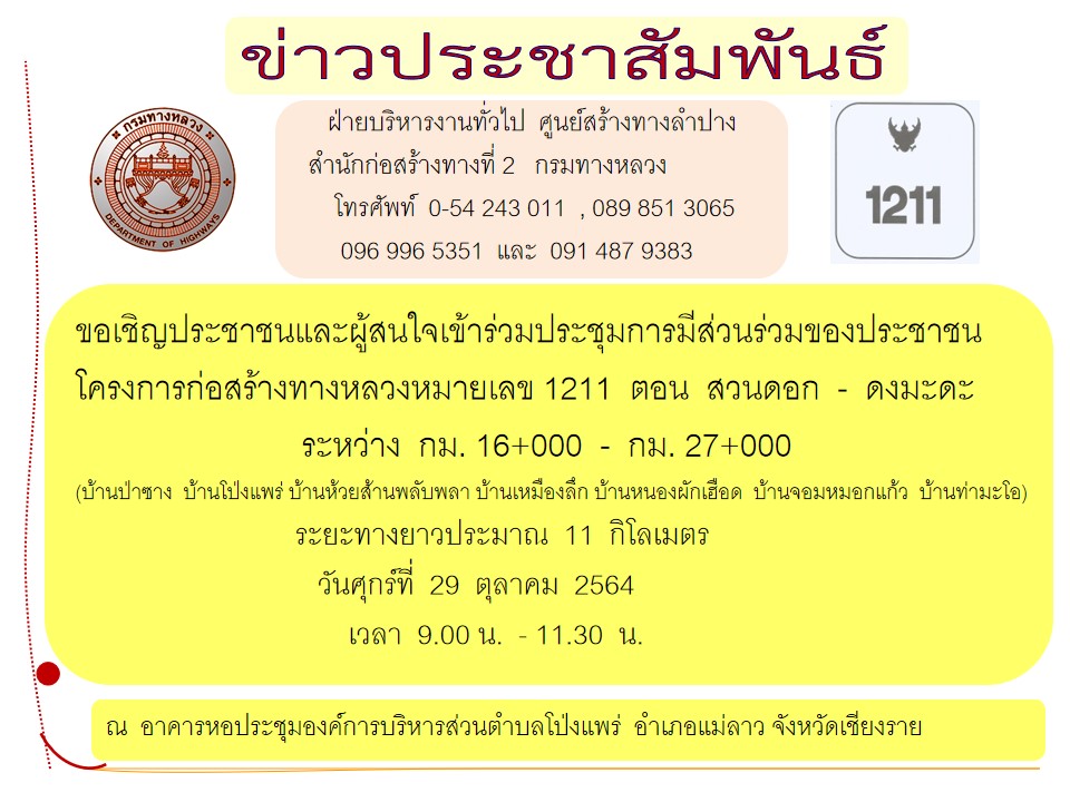 ขอเชิญประชาชนทั่วไปเข้าร่วมประชุมการมีส่วนร่วมของประชาชน โครงการก่อสร้างทางหลวงหมายเลข 1211 ตอน สวนดอก - ดงมะดะ
