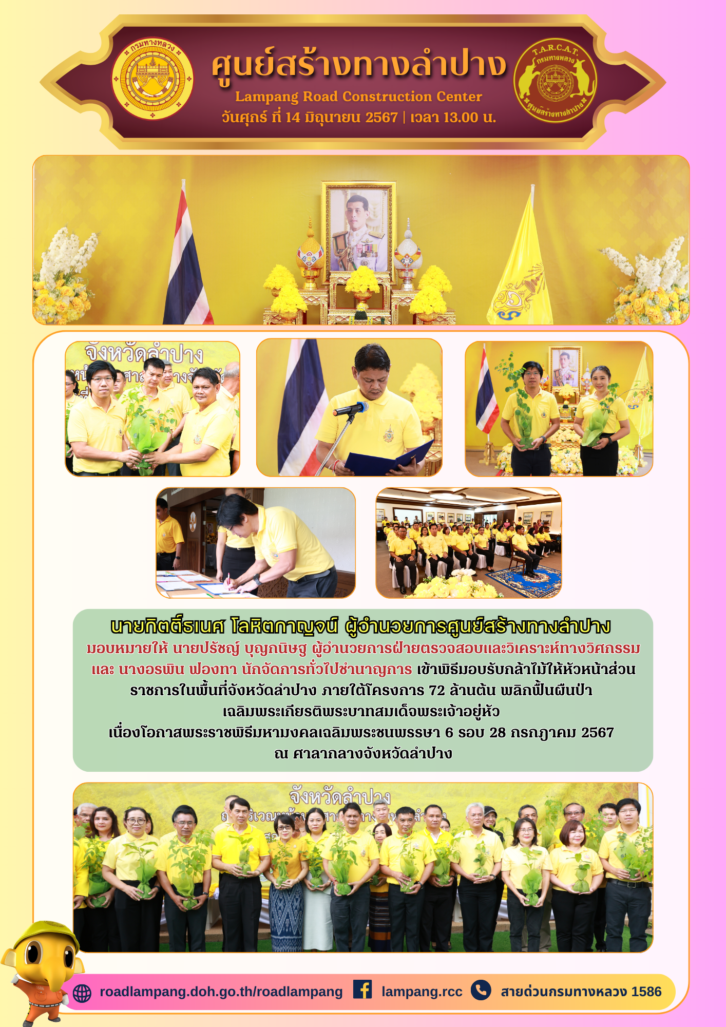เข้าร่วมพิธีมอบรับกล้าไม้ให้หัวหน้าส่วนราชการในพื้นที่จังหวัดลำปาง ภายใต้โครงการ 72 ล้านต้น พลิกฟื้นผืนป่า เฉลิมพระเกียรติพระบาทสมเด็จพระเจ้าอยู่หัว เนื่องโอกาสพระราชพิธีมหามงคลเฉลิมพระชนพรรษา 6 รอบ 28 กรกฎาคม 2567