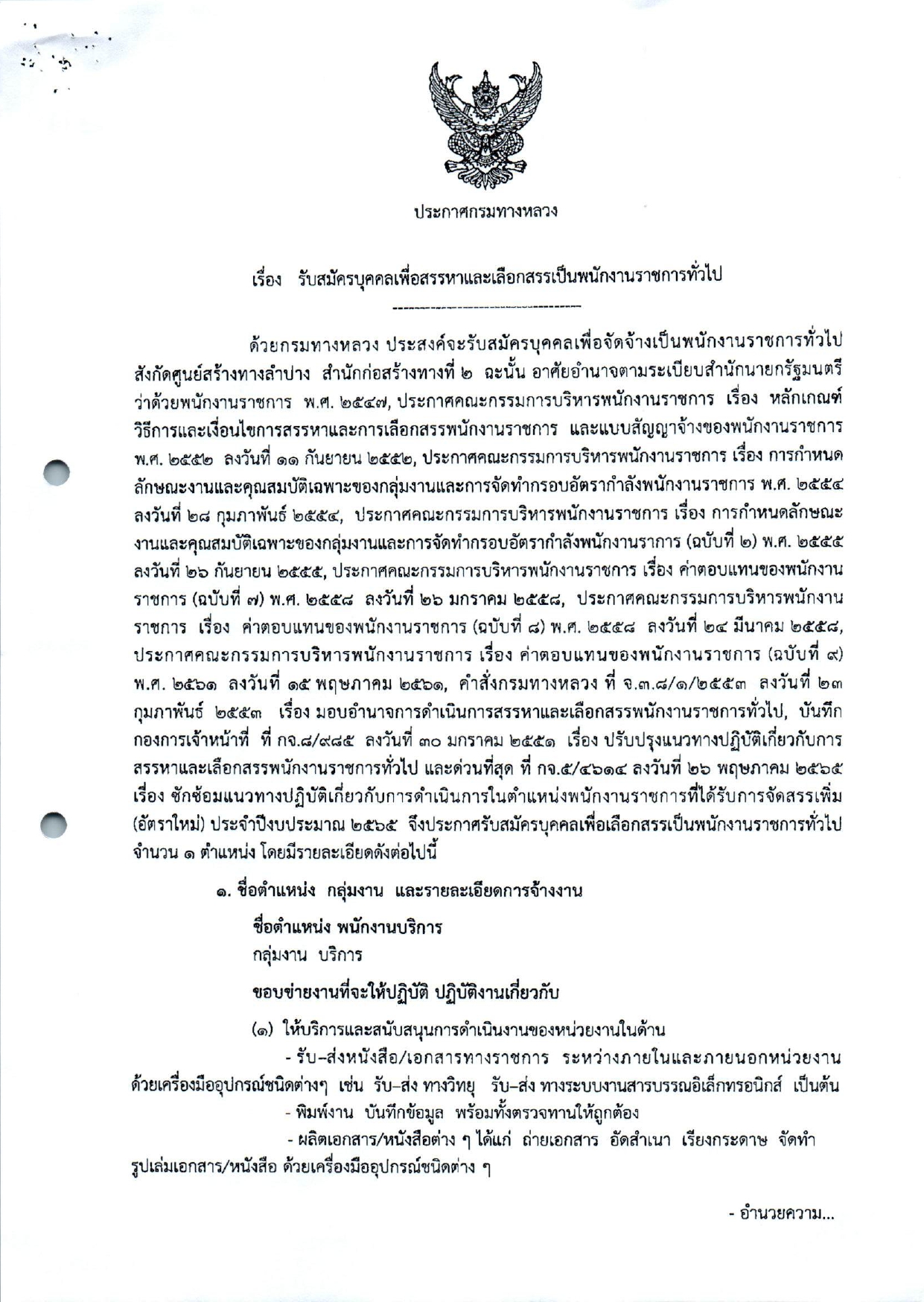 ประกาศศูนย์สร้างทางลำปาง รับสมัครบุคคล เพื่อสรรหาและเลือกสรรเป็นพนักงานราชการทั่วไป ตำแหน่ง พนักงานบริการ จำนวน 1 อัตรา