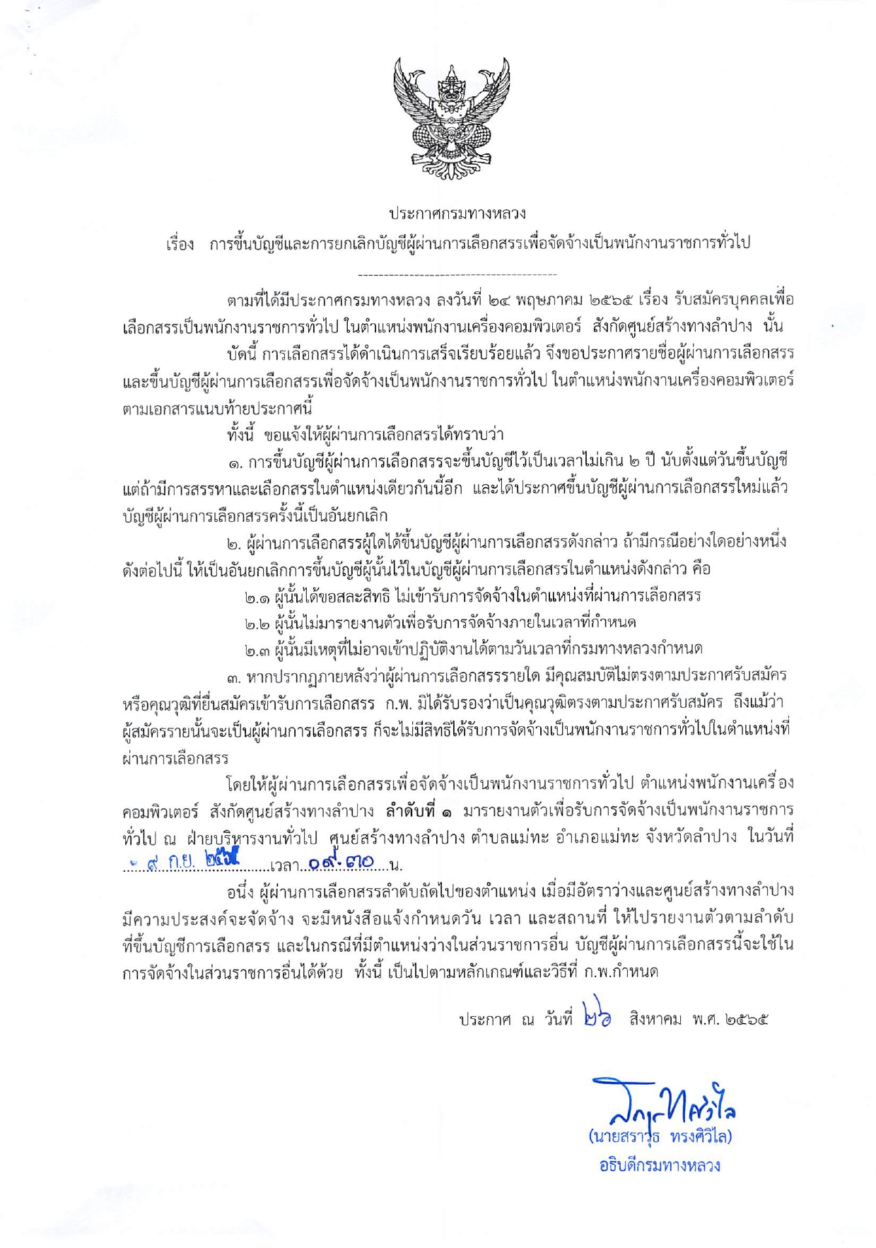 ประกาศการขึ้นบัญชีและการยกเลิกบัญชีรายชื่อผู้ผ่านการเลือกสรรเพื่อจัดจ้างเป็นพนักงานราชการทั่วไป ตำแหน่ง พนักงานเครื่องคอมพิวเตอร์