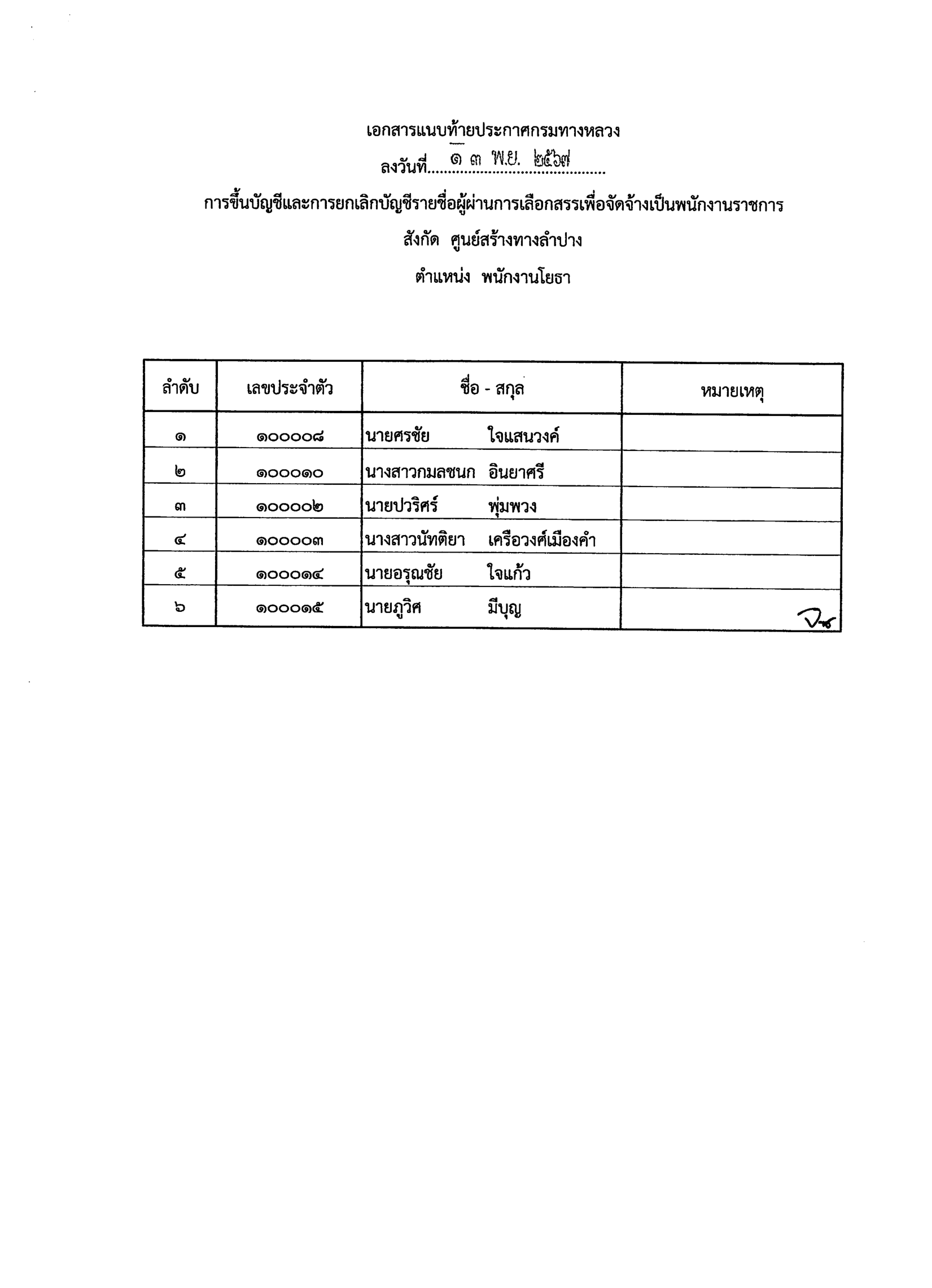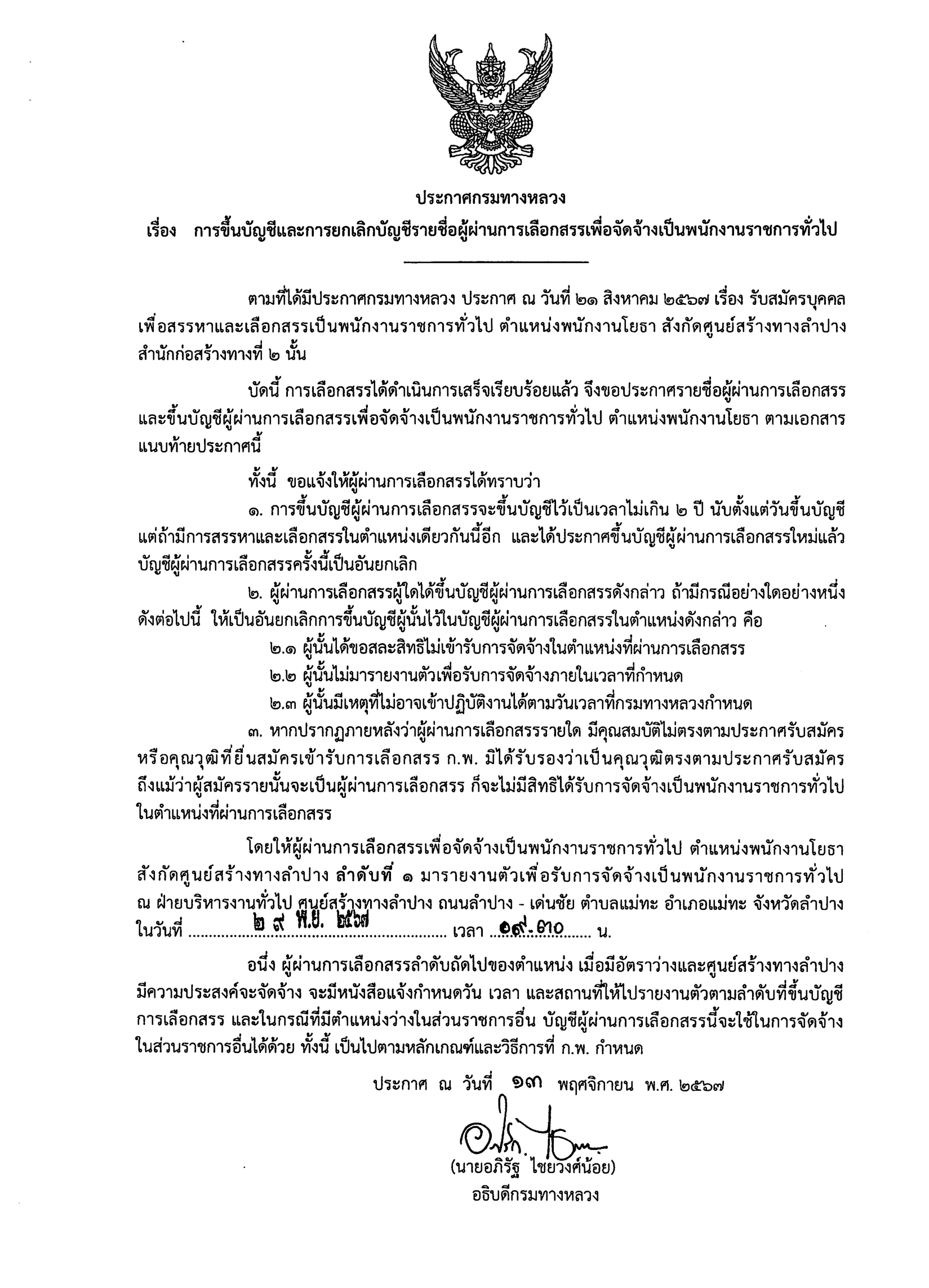 ประกาศการขึ้นบัญชีและการยกเลิกบัญชีรายชื่อผู้ผ่านการเลือกสรรเพื่อจัดจ้างเป็นพนักงานราชการทั่วไป ตำแหน่ง พนักงานโยธา