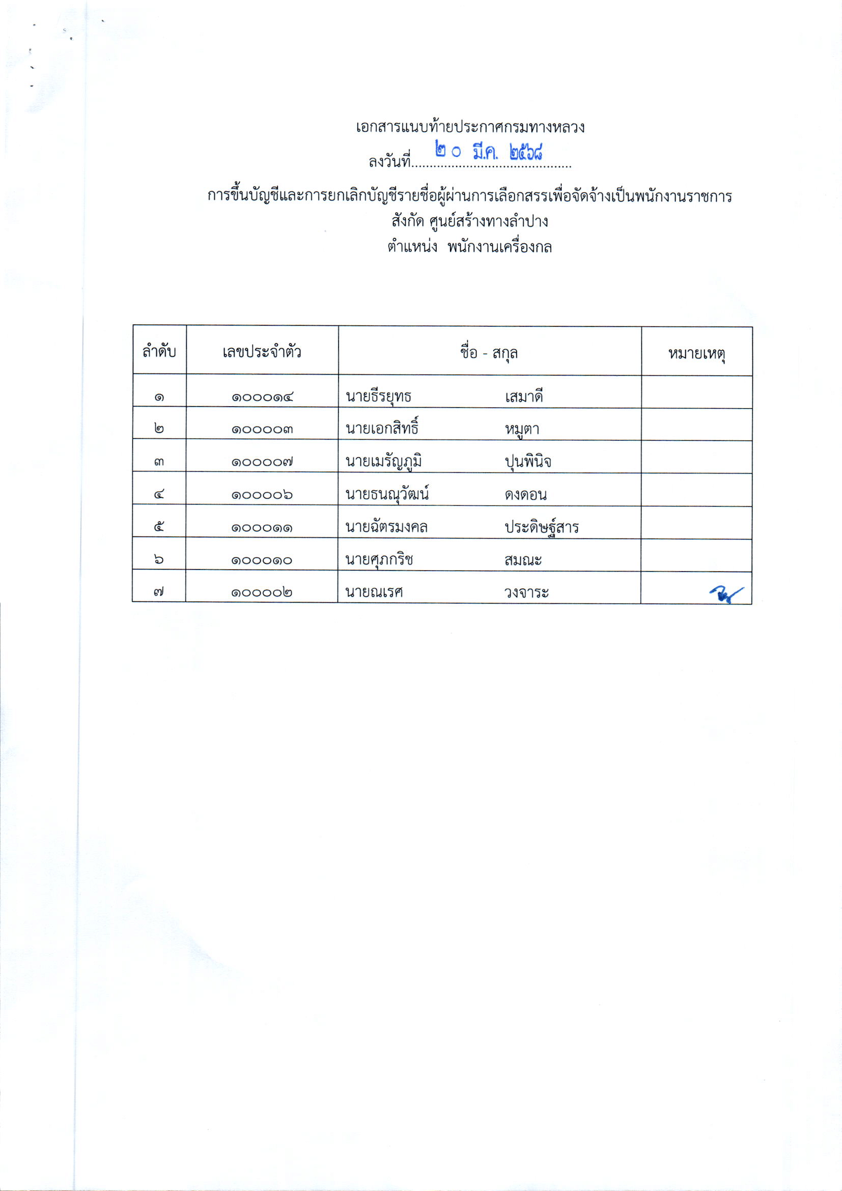 ประกาศรายชื่อผู้ได้รับการจัดสรรเป็นพนักงานราชการ ตำแหน่งพนักงานเครื่องกล