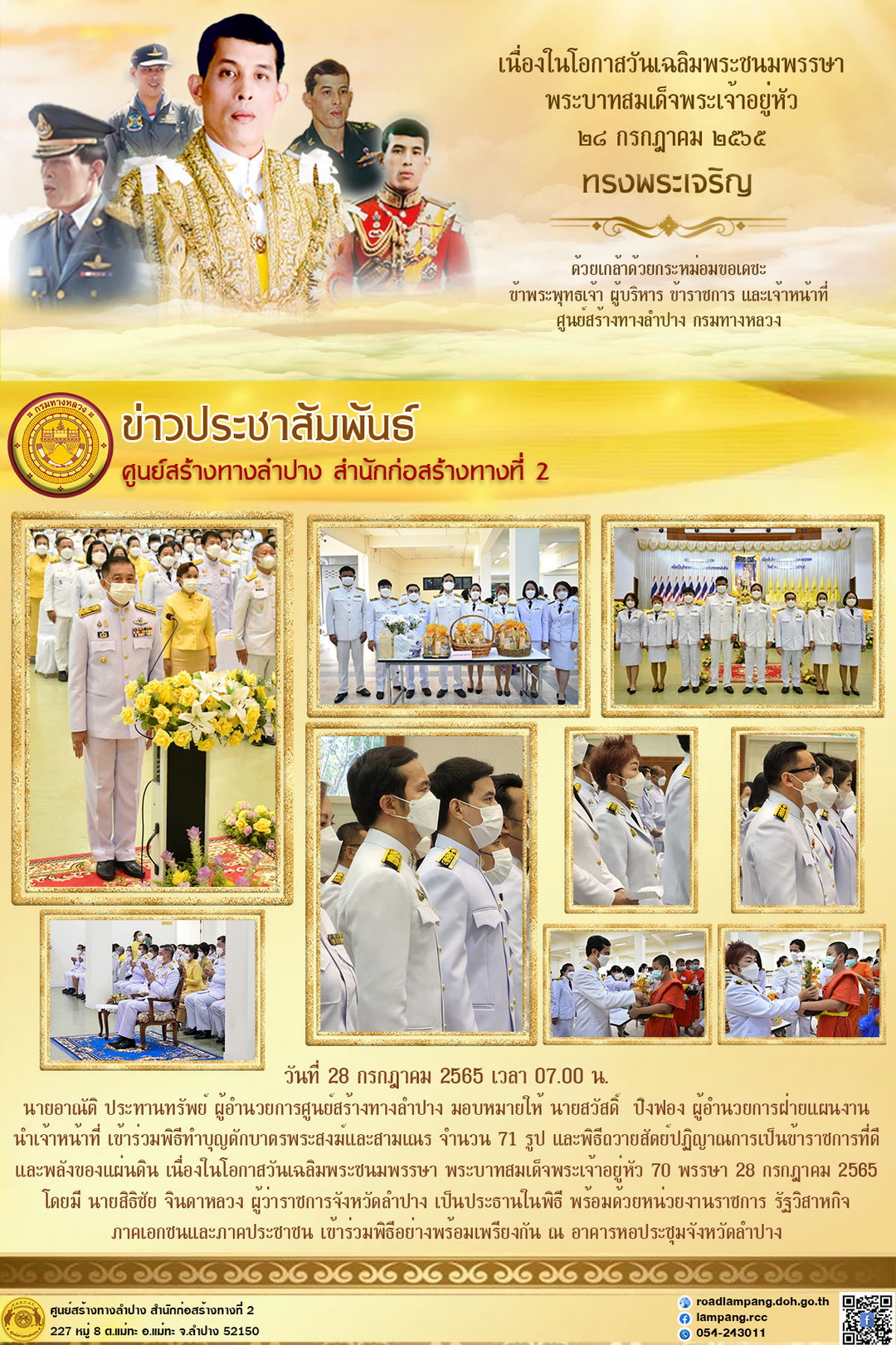 นายสวัสดิ์ ปิงฟอง ผู้อำนวยการฝ่ายแผนงาน นำเจ้าหน้าที่ เข้าร่วมพิธีทำบุญตักบาตรพระสงฆ์และสามเณร จำนวน 71 รูป และพิธีถวายสัตย์ปฏิญาณการเป็นข้าราชการที่ดีและพลังของแผ่นดิน เนื่องในโอกาสวันเฉลิมพระชนมพรรษา พระบาทสมเด็จพระเจ้าอยู่หัว 70 พรรษา 28 กรกฎาคม 2565 โดยมี นายสิธิชัย จินดาหลวง ผู้ว่าราชการจังหวัดลำปาง เป็นประธานในพิธี พร้อมด้วยหน่วยงานราชการ รัฐวิสาหกิจ ภาคเอกชนและภาคประชาชน เข้าร่วมพิธีอย่างพร้อมเพรียงกัน