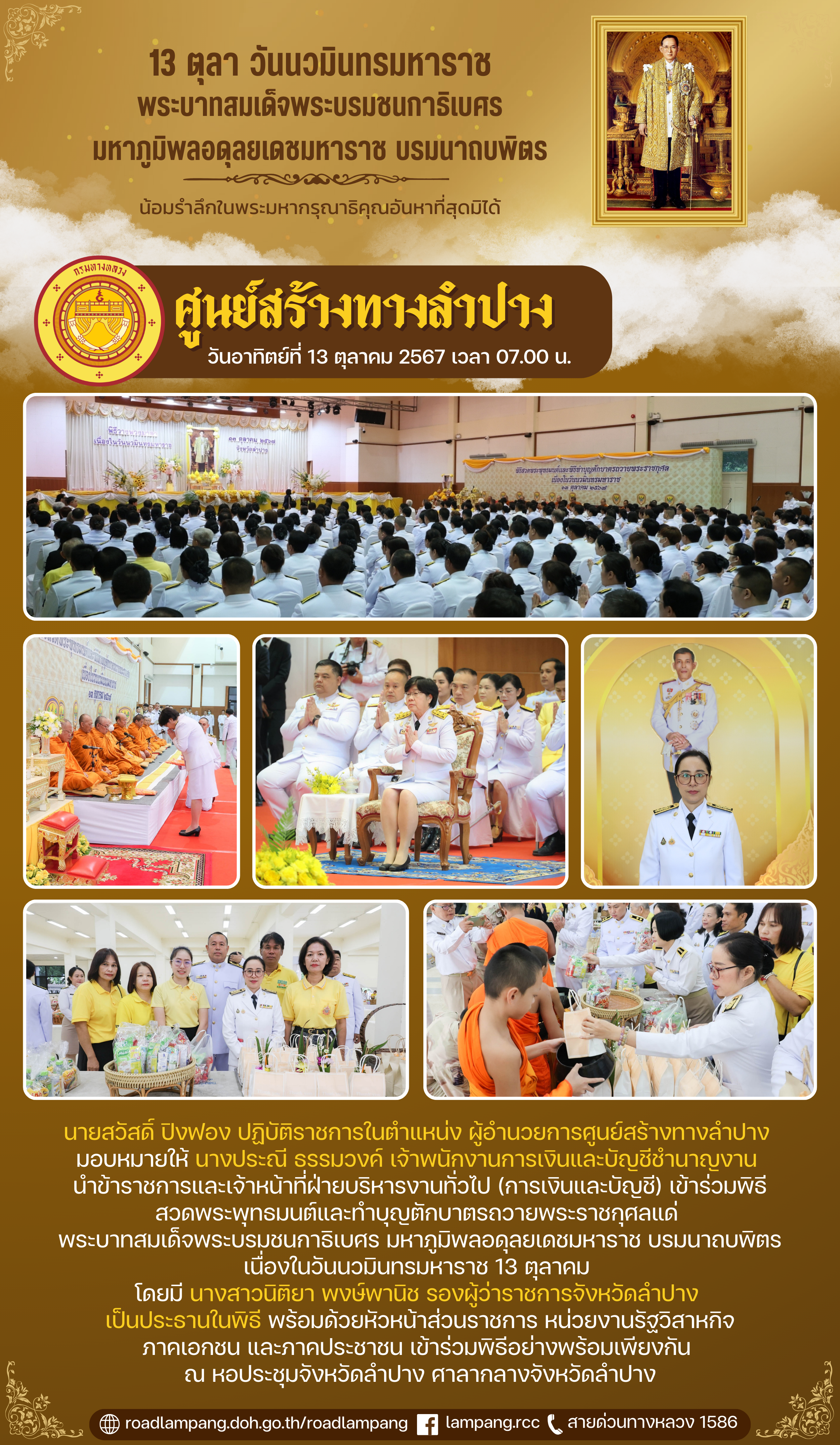 นายสวัสดิ์ ปิงฟอง ปฏิบัติราชการในตำแหน่ง ผู้อำนวยการศูนย์สร้างทางลำปาง มอบหมายให้ นางประณี ธรรมวงค์ เจ้าพนักงานการเงินและบัญชีชำนาญงาน นำข้าราชการและเจ้าหน้าที่ฝ่ายบริหารงานทั่วไป (การเงินและบัญชี) เข้าร่วมพิธีสวดพระพุทธมนต์และทำบุญตักบาตรถวายพระราชกุศลแด่ พระบาทสมเด็จพระบรมชนกาธิเบศร มหาภูมิพลอดุลยเดชมหาราช บรมนาถบพิตร เนื่องในวันนวมินทรมหาราช 13 ตุลาคม โดยมี นางสาวนิติยา พงษ์พานิช รองผู้ว่าราชการจังหวัดลำปาง เป็นประธานในพิธี พร้อมด้วยหัวหน้าส่วนราชการ หน่วยงานรัฐวิสาหกิจ ภาคเอกชน และภาคประชาชน เข้าร่วมพิธีอย่างพร้อมเพียงกัน ณ หอประชุมจังหวัดลำปาง ศาลากลางจังหวัดลำปาง