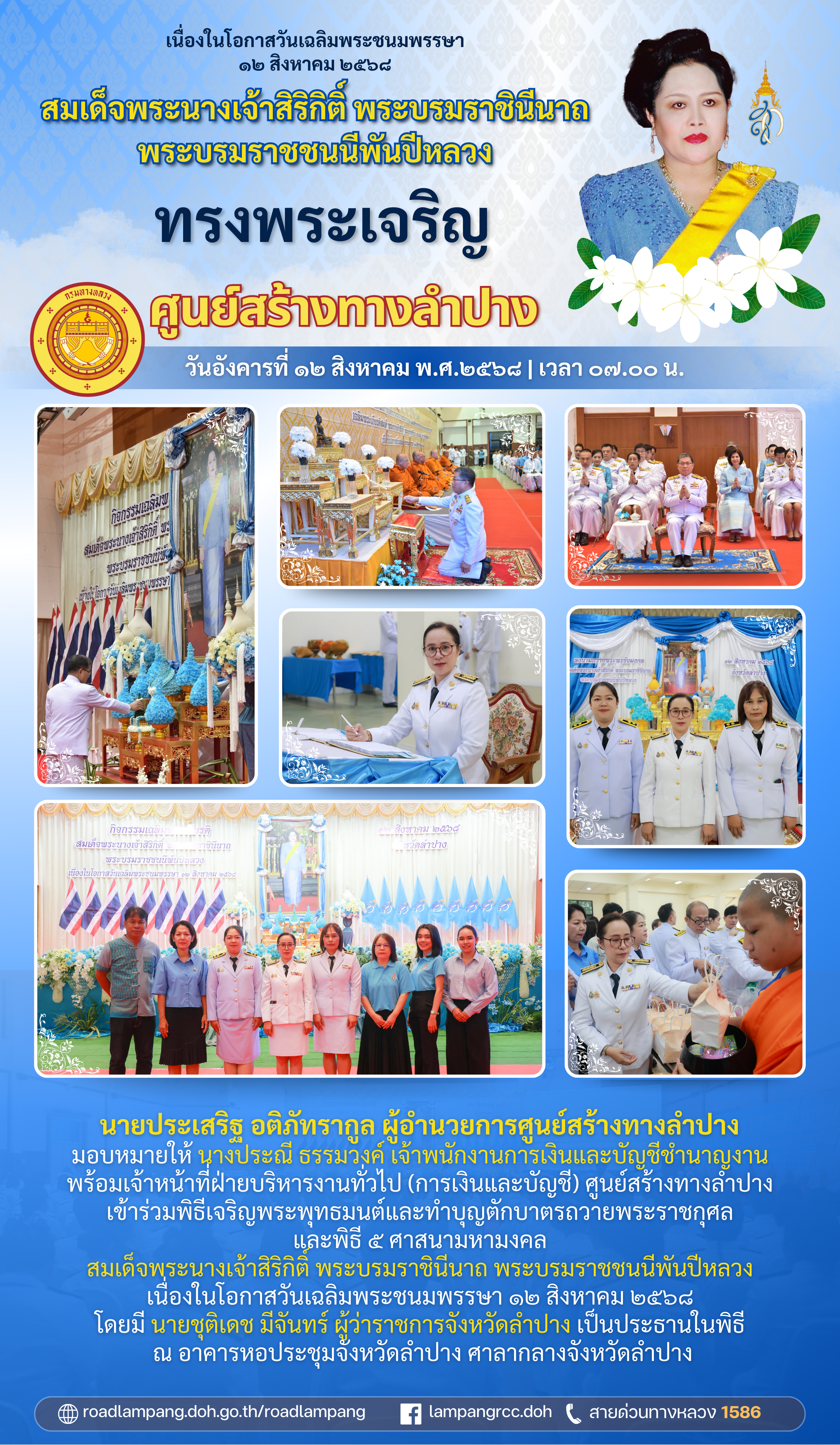 นายประเสริฐ อติภัทรากูล ผู้อำนวยการศูนย์สร้างทางลำปาง มอบหมายให้ นางประณี ธรรมวงค์ เจ้าพนักงานการเงินและบัญชีชำนาญงาน พร้อมเจ้าหน้าที่ฝ่ายบริหารงานทั่วไป (การเงินและบัญชี) ศูนย์สร้างทางลำปาง เข้าร่วมพิธีเจริญพระพุทธมนต์และทำบุญตักบาตรถวายพระราชกุศล และพิธี 5 ศาสนามหามงคล สมเด็จพระนางเจ้าสิริกิติ์ พระบรมราชินีนาถ พระบรมราชชนนีพันปีหลวง เนื่องในโอกาสวันเฉลิมพระชนมพรรษา 12 สิงหาคม 2568 โดยมี นายชุติเดช มีจันทร์ ผู้ว่าราชการจังหวัดลำปาง เป็นประธานในพิธี ณ อาคารหอประชุมจังหวัดลำปาง ศาลากลางจังหวัดลำปาง