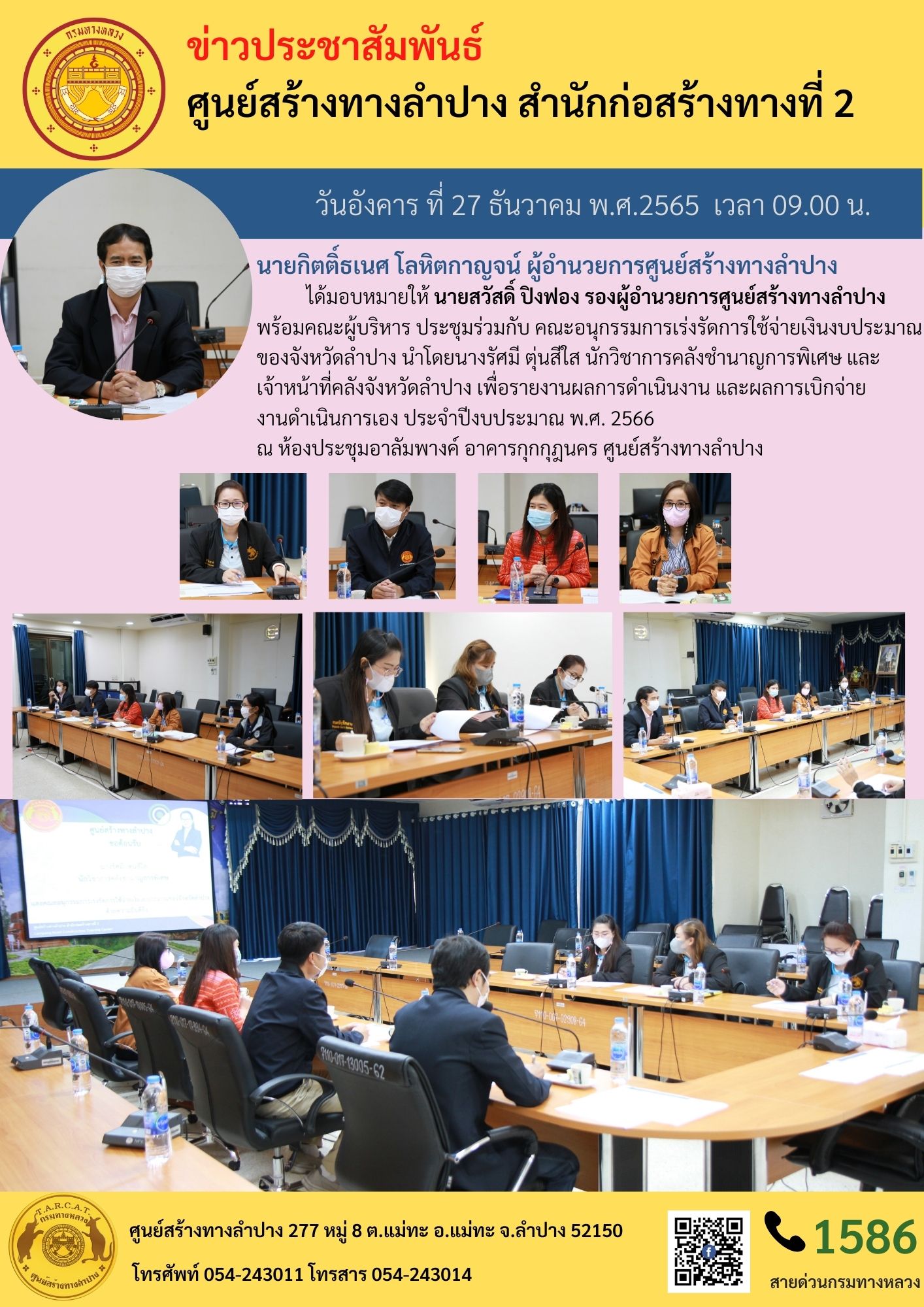 นายกิตติ์ธเนศ โลหิตกาญจน์ ผู้อำนวยการศูนย์สร้างทางลำปาง ได้มอบหมายให้ นายสวัสดิ์ ปิงฟอง รองผู้อำนวยการศูนย์สร้างทางลำปางพร้อมคณะผู้บริหาร ประชุมร่วมกับคณะอนุกรรมการเร่งรัดการใช้จ่ายเงินงบประมาณของจังหวัดลำปาง นำโดยนางรัศมี ตุ่นสีใส นักวิชาการคลังชำนาญการพิเศษ และเจ้าหน้าที่คลังจังหวัดลำปาง เพื่อรายงานผลการดำเนินงาน และผลการเบิกจ่ายงานดำเนินการเอง ประจำปีงบประมาณ พ.ศ. 2566 ณ ห้องประชุมอาลัมพางค์ อาคารกุกกุฎนคร ศูนย์สร้างทางลำปาง