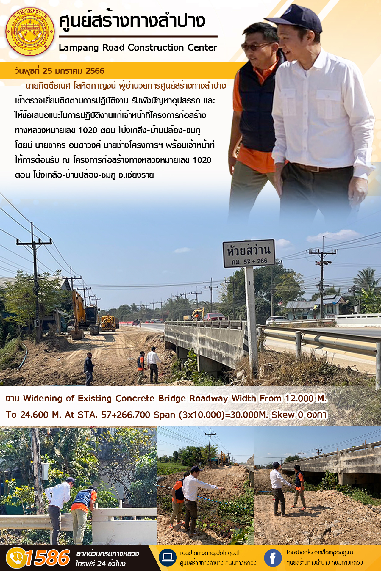 นายกิตติ์ธเนศ โลหิตกาญจน์ ผู้อำนวยการศูนย์สร้างทางลำปาง เข้าตรวจเยี่ยมติดตามการปฏิบัติงาน รับฟังปัญหาอุปสรรค และให้ข้อเสนอแนะในการปฏิบัติงานแก่เจ้าหน้าที่โครงการก่อสร้างทางหลวงหมายเลข 1020 ตอน โป่งเกลืง-บ้านปล้อง-ชมภู โดยมี นายชาคร อินดาวงศ์ นายช่างโครงการฯ พร้อมเจ้าหน้าที่ ให้การต้อนรับ ณ โครงการก่อสร้างทางหลวงหมายเลข 1020 ตอน โป่งเกลือ-บ้านปล้อง-ชมภู จ.เชียงราย