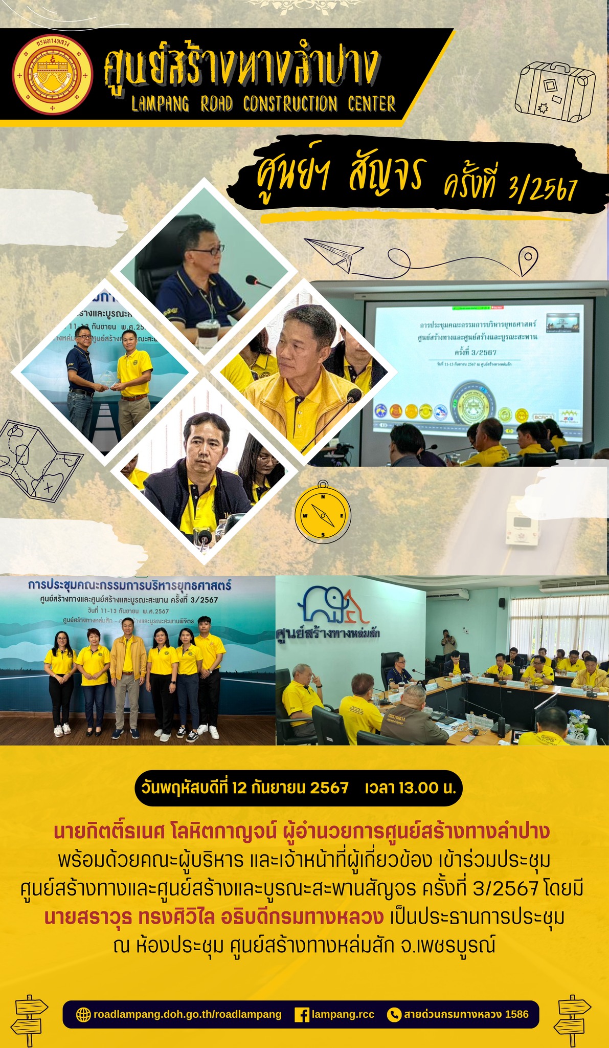 นายกิตติ์ธเนศ โลหิตกาญจน์ ผู้อำนวยการศูนย์สร้างทางลำปาง พร้อมด้วยคณะผู้บริหาร และเจ้าหน้าที่ผู้เกี่ยวข้อง เข้าร่วมประชุมศูนย์สร้างทางและศูนย์สร้างและบูรณะสะพานสัญจร ครั้งที่ 3/2567 โดยมี นายสราวุธ ทรงศิวิไล อธิบดีกรมทางหลวง เป็นประธานการประชุม ณ ห้องประชุม ศูนย์สร้างทางหล่มสัก จ.เพชรบูรณ์