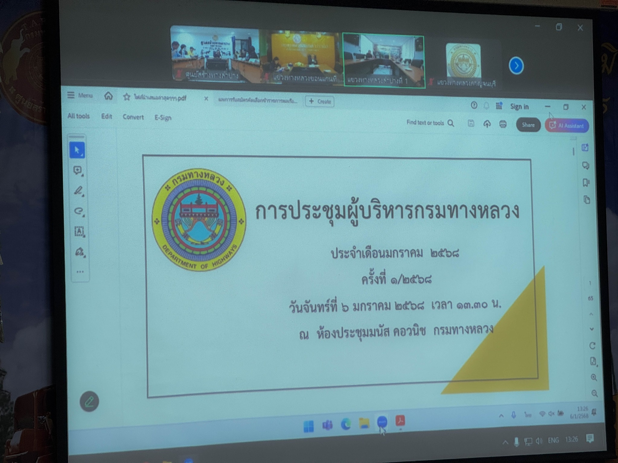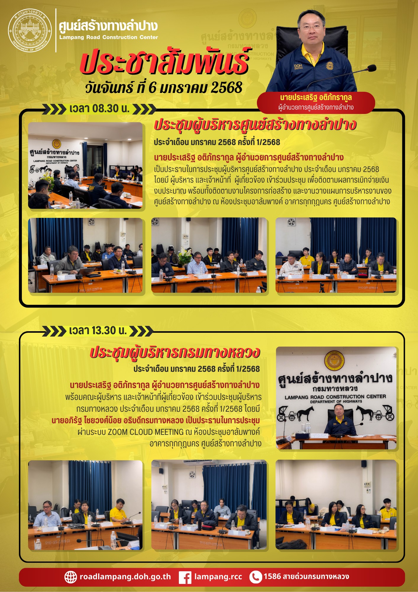 นายประเสริฐ อติภัทรากูล ผู้อำนวยการศูนย์สร้างทางลำปาง พร้อมคณะผู้บริหาร และเจ้าหน้าที่ผู้เกี่ยวข้อง เข้าร่วมประชุมผู้บริหารกรมทางหลวง ประจำเดือน มกราคม 2568 ครั้งที่ 1/2568 โดยมี นายอภิรัฐ ไชยวงศ์น้อย อธิบดีกรมทางหลวง เป็นประธานในการประชุม ผ่านระบบ Zoom Cloud Meeting ณ ห้องประชุมอาลัมพางค์ อาคารกุกกุฎนคร ศูนย์สร้างทางลำปาง
