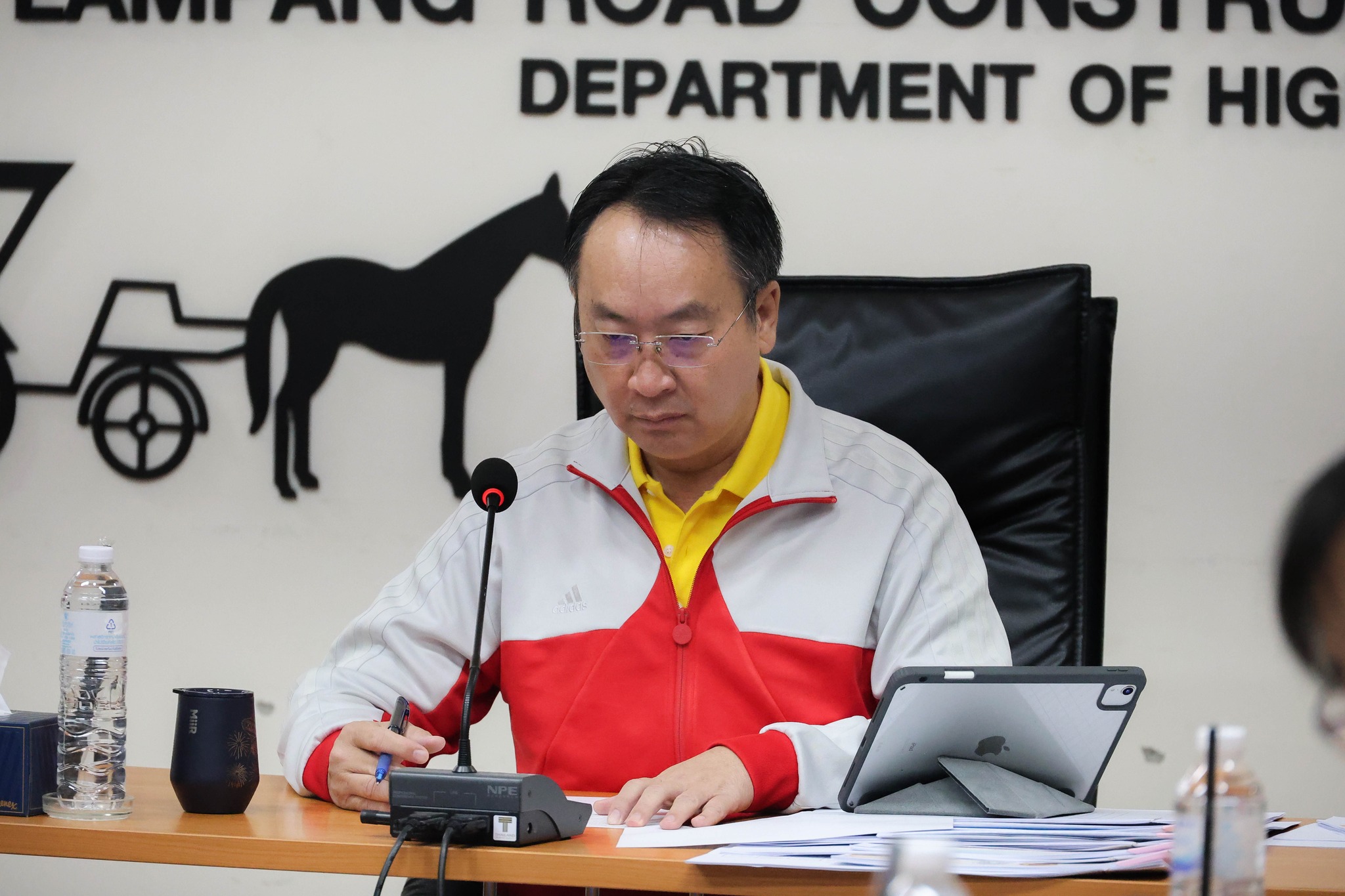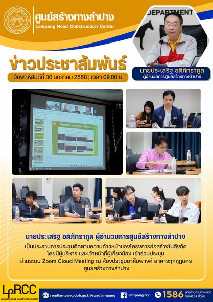 นายประเสริฐ อติภัทรากูล ผู้อำนวยการศูนย์สร้างทางลำปาง เป็นประธานการประชุมติดตามความก้าวหน้าของโครงการก่อสร้างในสังกัด โดยมีผู้บริหาร และเจ้าหน้าที่ผู้เกี่ยวข้อง เข้าร่วมประชุม ผ่านระบบ Zoom Cloud Meeting ณ ห้องประชุมอาลัมพางค์ อาคารกุกกุฎนคร ศูนย์สร้างทางลำปาง