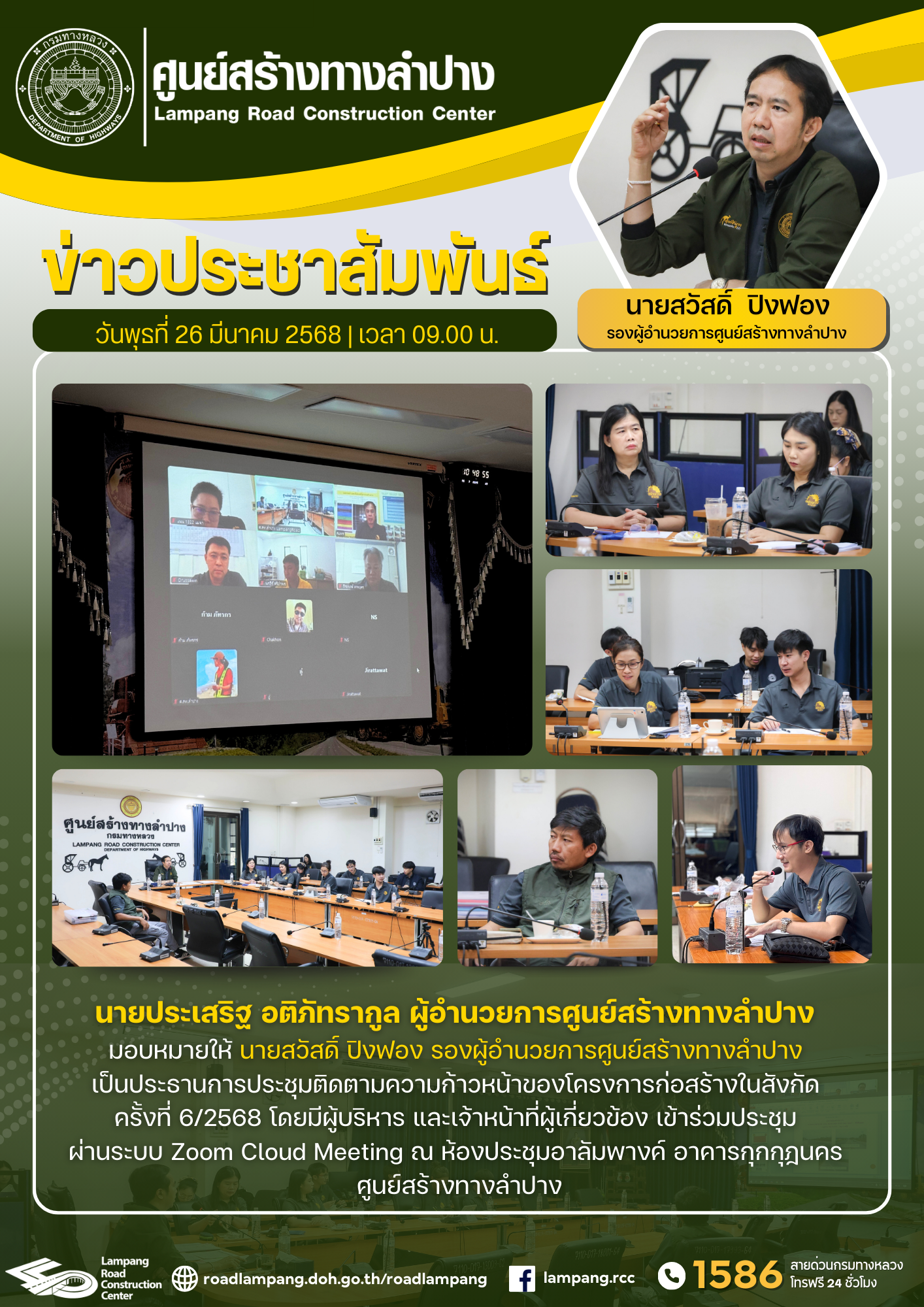 นายประเสริฐ อติภัทรากูล ผู้อำนวยการศูนย์สร้างทางลำปาง มอบหมายให้ นายสวัสดิ์ ปิงฟอง รองผู้อำนวยการศูนย์สร้างทางลำปาง เป็นประธานการประชุมติดตามความก้าวหน้าของโครงการก่อสร้างในสังกัด ครั้งที่ 6/2568 โดยมีผู้บริหาร และเจ้าหน้าที่ผู้เกี่ยวข้อง เข้าร่วมประชุม ผ่านระบบ Zoom Cloud Meeting ณ ห้องประชุมอาลัมพางค์ อาคารกุกกุฎนคร ศูนย์สร้างทางลำปาง