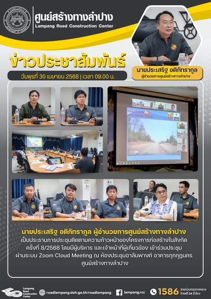นายประเสริฐ อติภัทรากูล ผู้อำนวยการศูนย์สร้างทางลำปาง เป็นประธานการประชุมติดตามความก้าวหน้าของโครงการก่อสร้างในสังกัด ครั้งที่ 8/2568 โดยมีผู้บริหาร และเจ้าหน้าที่ผู้เกี่ยวข้อง เข้าร่วมประชุม ผ่านระบบ Zoom Cloud Meeting ณ ห้องประชุมอาลัมพางค์ อาคารกุกกุฎนคร ศูนย์สร้างทางลำปาง