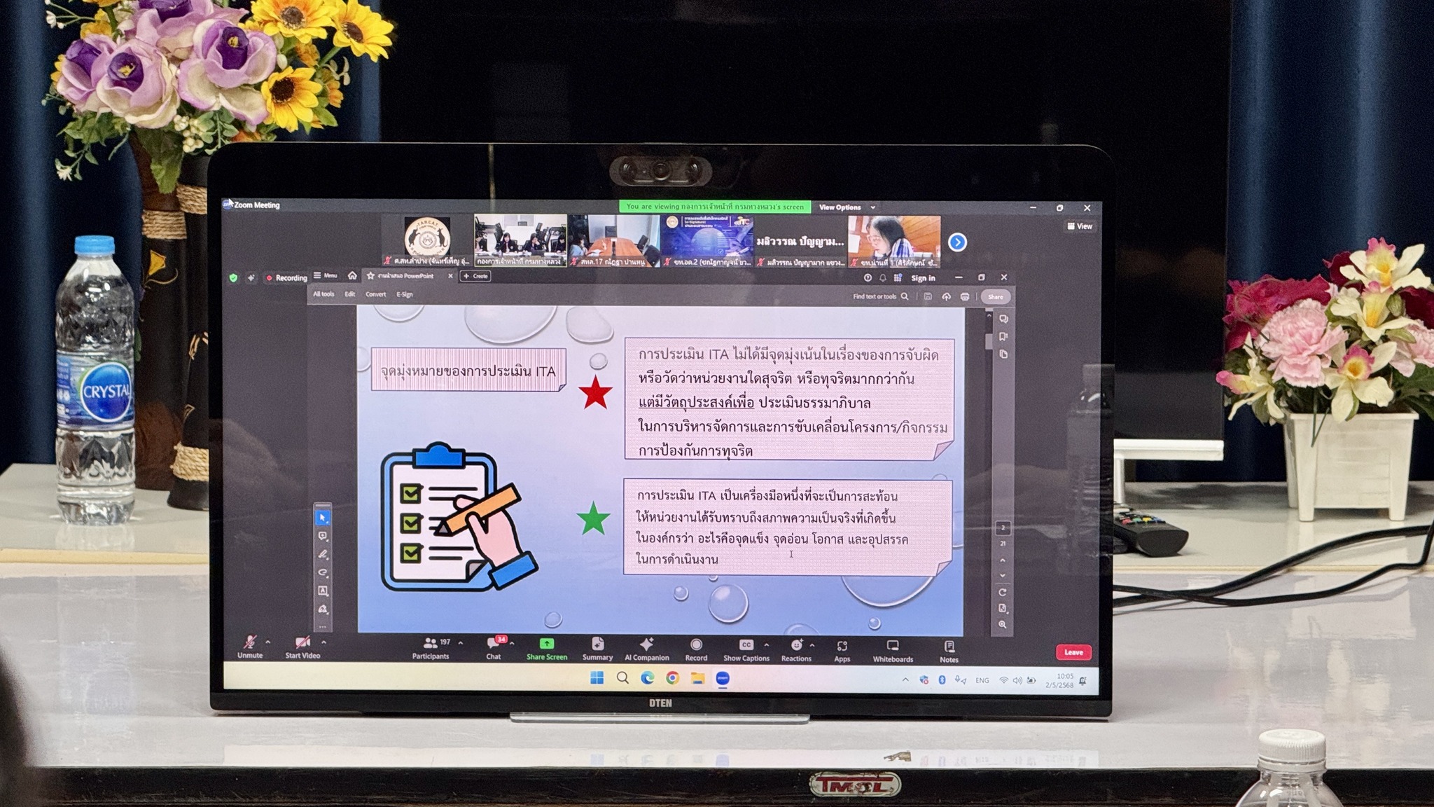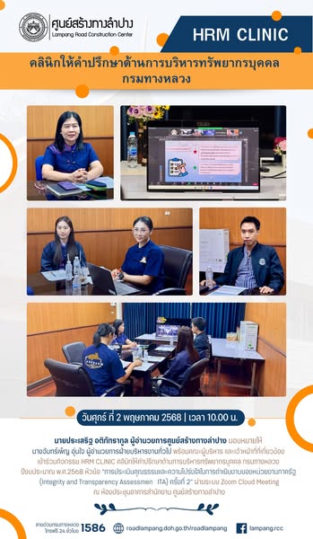 นายประเสริฐ อติภัทรากูล ผู้อำนวยการศูนย์สร้างทางลำปาง มอบหมายให้ นางจันทร์เพ็ญ อุ่นใจ ผู้อำนวยการฝ่ายบริหารงานทั่วไป พร้อมคณะผู้บริหาร และเจ้าหน้าที่ที่เกี่ยวข้อง เข้าร่วมกิจกรรม HRM CLINIC คลินิกให้คำปรึกษาด้านการบริหารทรัพยากรบุคคล กรมทางหลวง ปีงบประมาณ พ.ศ.2568 หัวข้อ “การประเมินคุณธรรมและความโปร่งใสในการดำเนินงานของหน่วยงานภาครัฐ (Integrity and Transparency Assessmen : ITA) ครั้งที่ 2" ผ่านระบบ Zoom Cloud Meeting ณ ห้องประชุมอาคารสำนักงาน ศูนย์สร้างทางลำปาง