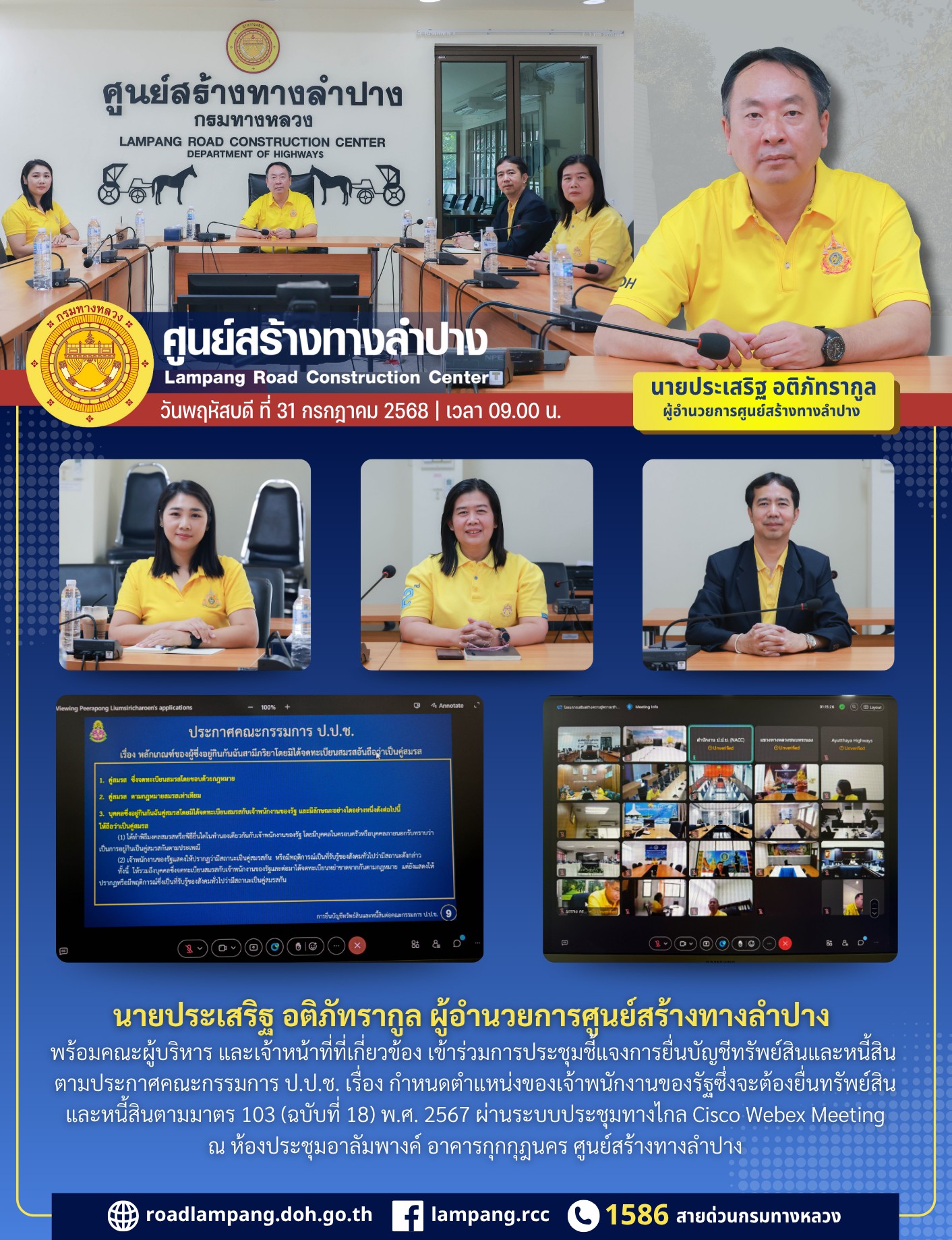 นายประเสริฐ อติภัทรากูล ผู้อำนวยการศูนย์สร้างทางลำปาง พร้อมคณะผู้บริหาร และเจ้าหน้าที่ที่เกี่ยวข้อง เข้าร่วมการประชุมชี้แจงการยื่นบัญชีทรัพย์สินและหนี้สิน ตามประกาศคณะกรรมการ ป.ป.ช. เรื่อง กำหนดตำแหน่งของเจ้าพนักงานของรัฐซึ่งจะต้องยื่นทรัพย์สินและหนี้สินตามมาตร 103 (ฉบับที่ 18) พ.ศ. 2567 ผ่านระบบประชุมทางไกล Cisco Webex Meeting ณ ห้องประชุมอาลัมพางค์ อาคารกุกกุฎนคร ศูนย์สร้างทางลำปาง