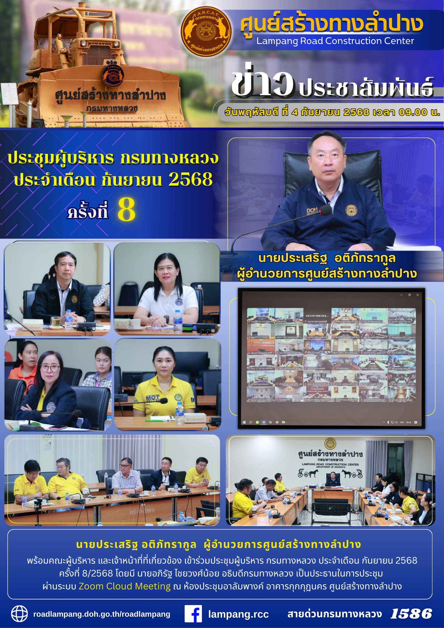 พร้อมคณะผู้บริหาร และเจ้าหน้าที่ที่เกี่ยวข้อง เข้าร่วมประชุมผู้บริหาร กรมทางหลวง ประจำเดือน กันยายน 2568 ครั้งที่ 8/2568 โดยมี นายอภิรัฐ ไชยวงศ์น้อย อธิบดีกรมทางหลวง เป็นประธานในการประชุม ผ่านระบบ Zoom Cloud Meeting ณ ห้องประชุมอาลัมพางค์ อาคารกุกกุฎนคร ศูนย์สร้างทางลำปาง