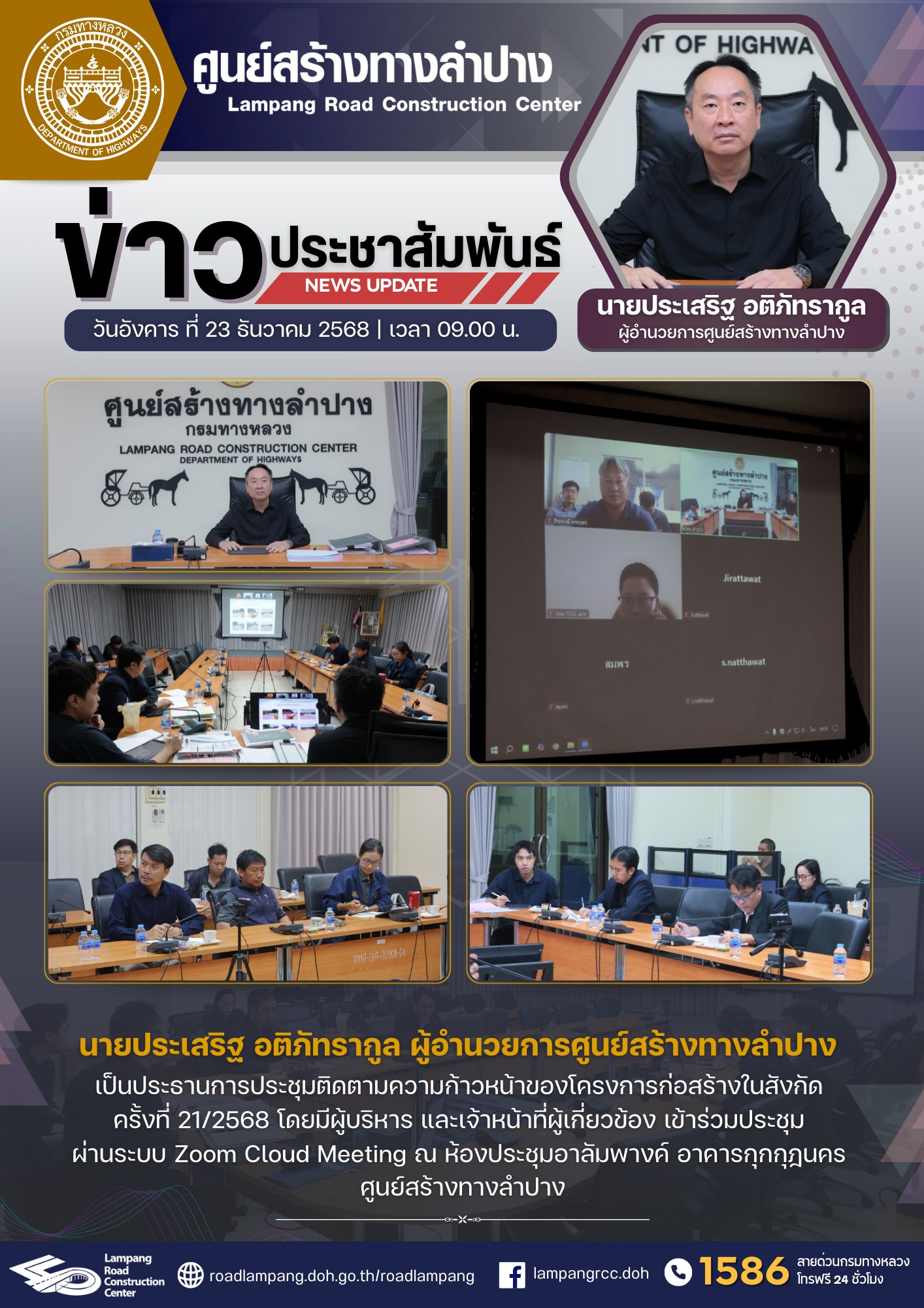 นายประเสริฐ อติภัทรากูล ผู้อำนวยการศูนย์สร้างทางลำปาง เป็นประธานการประชุมติดตามความก้าวหน้าของโครงการก่อสร้างในสังกัด ครั้งที่ 21/2568 โดยมีผู้บริหาร และเจ้าหน้าที่ผู้เกี่ยวข้อง เข้าร่วมประชุม ผ่านระบบ Zoom Cloud Meeting ณ ห้องประชุมอาลัมพางค์ อาคารกุกกุฎนคร ศูนย์สร้างทางลำปาง