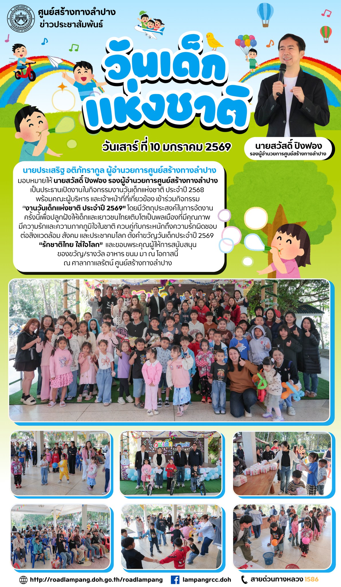 นายประเสริฐ อติภัทรากูล ผู้อำนวยการศูนย์สร้างทางลำปาง มอบหมายให้ นายสวัสดิ์ ปิงฟอง รองผู้อำนวยการศูนย์สร้างทางลำปาง เป็นประธานเปิดงานในกิจกรรมงานวันเด็กแห่งชาติ ประจำปี 2568 พร้อมคณะผู้บริหาร และเจ้าหน้าที่ที่เกี่ยวข้อง เข้าร่วมกิจกรรม “งานวันเด็กแห่งชาติ ประจำปี 2569" โดยมีวัตถุประสงค์ในการจัดงานครั้งนี้เพื่อปลูกฝังให้เด็กและเยาวชนไทยเติบโตเป็นพลเมืองที่มีคุณภาพ มีความรักและความภาคภูมิใจในชาติ ควบคู่กับกระหนักถึงความรักผิดชอบต่อสิ่งแวดล้อม สังคม และประชาคมโลก ดังคำขวัญวันเด็กประจำปี 2569 “รักชาติไทย ใส่ใจโลก” และขอบพระคุณผู้ให้การสนับสนุน ของขวัญ/รางวัล อาหาร ขนม มา ณ โอกาสนี้ ณ ศาลากาแลรัตน์ ศูนย์สร้างทางลำปาง