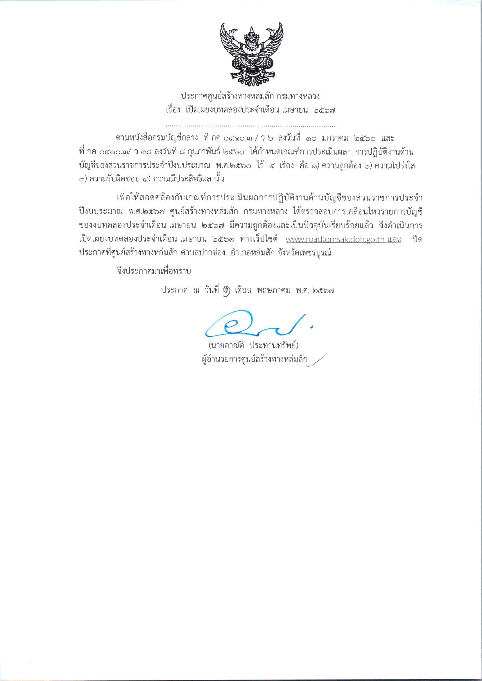 ประกาศเปิดเผยงบทดลองประจำเดือน พฤษภาคม 2567 ปีงบประมาณ 2567