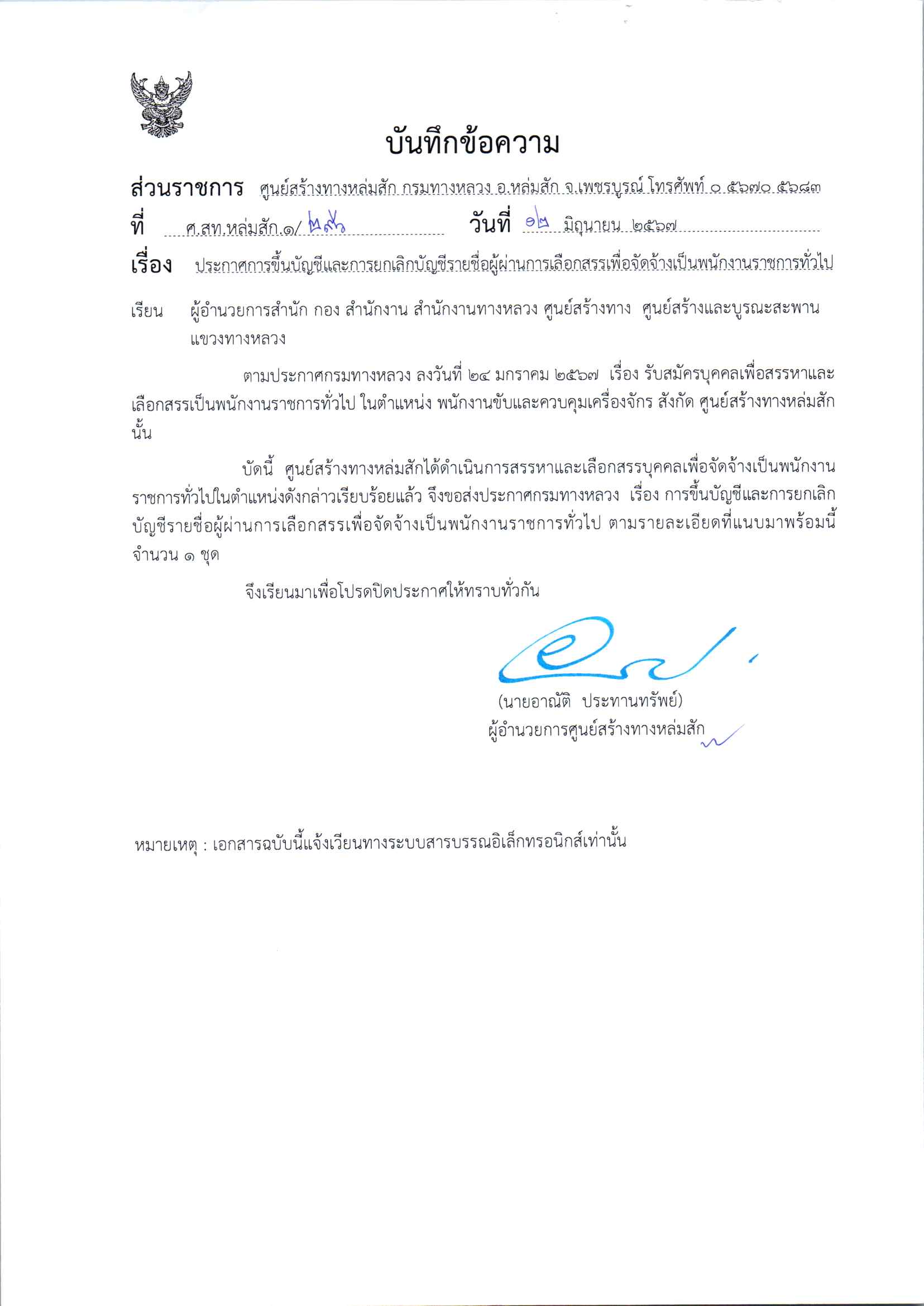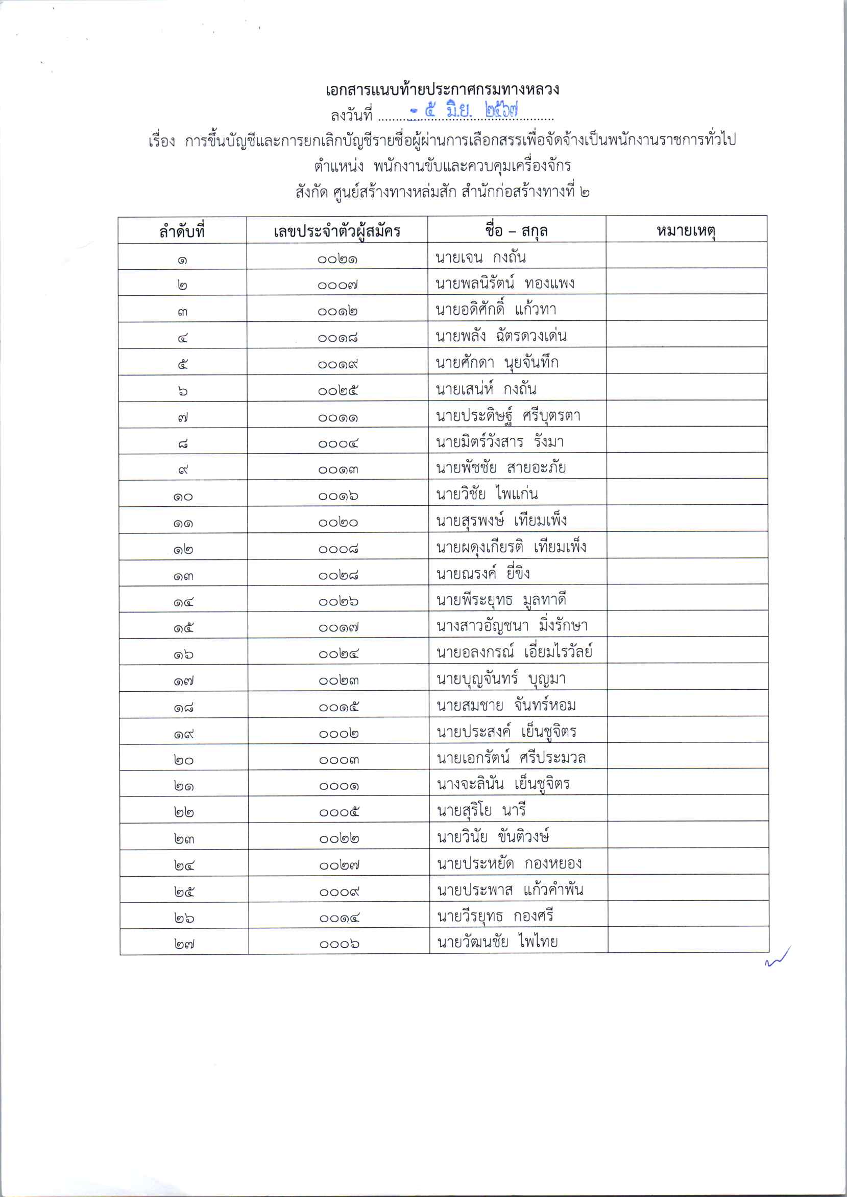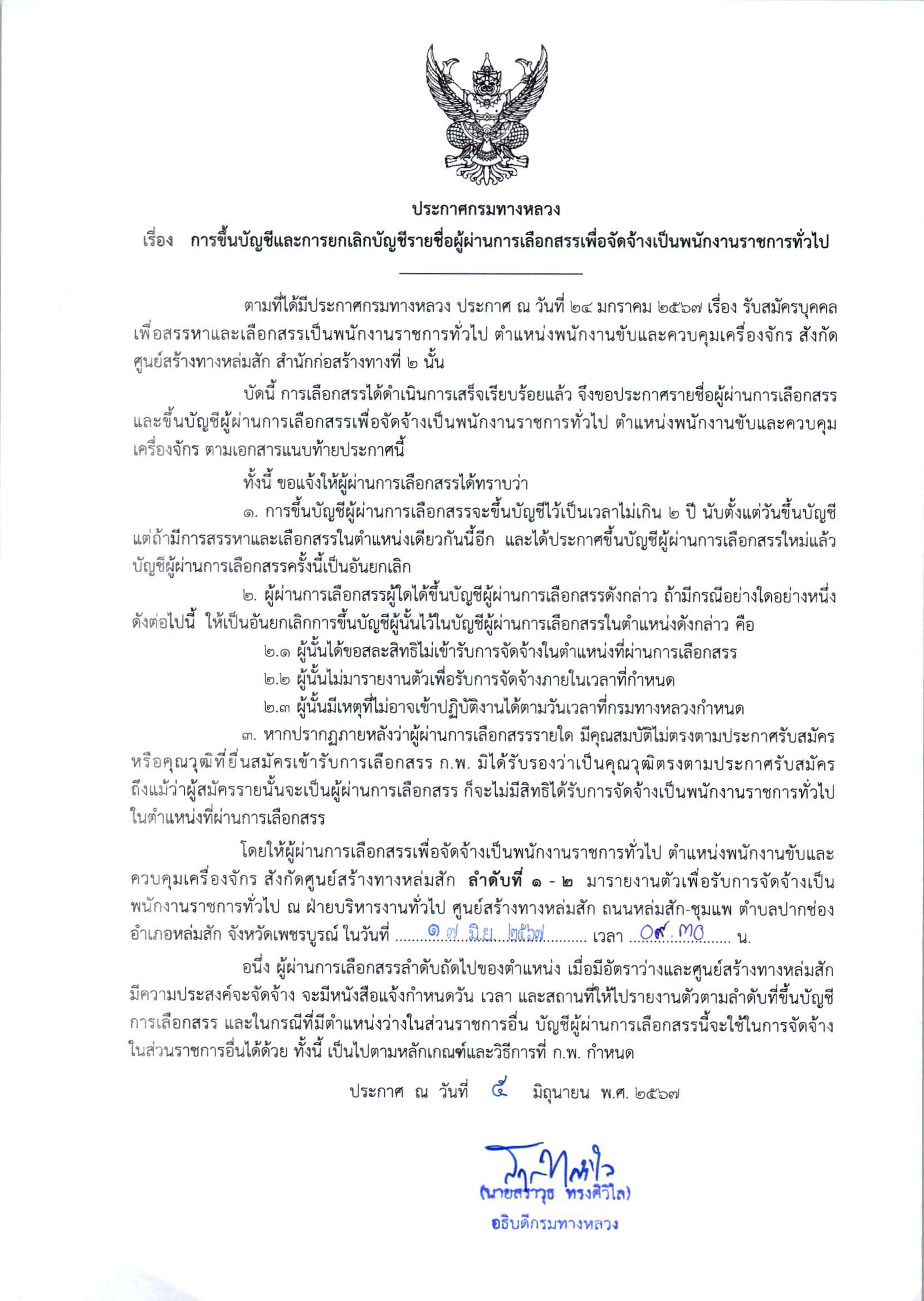 ประะกาศการขึ้นบัญชีและการยกเลิกบัญชีรายชื่อผู้ผ่านการเลือกสรรเพื่อจัดจ้างเป็นพนักงานราชการทั่วไป ตำแหน่ง พนักงานขับและควบคุมเครื่องจักร สังกัดศูนย์สร้างทางหล่มสัก
