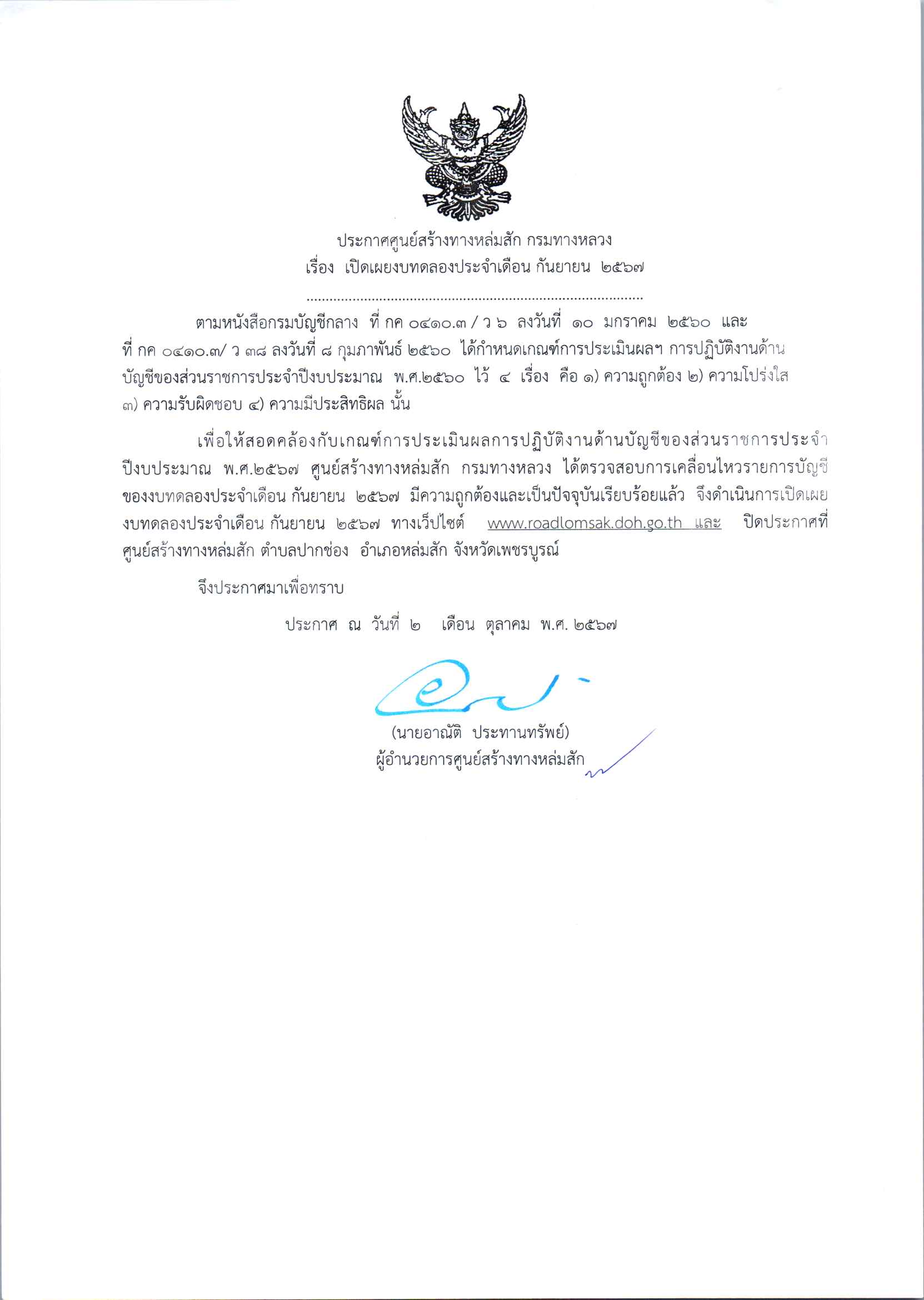 ประกาศเปิดเผยงบทดลองประจำเดือน กันยายน 2567 ปีงบประมาณ 2567 ตามหนังสือกรมบัญชีกลาง ที่ กค 0410.3/ว 6 ลงวันที่ 10 มกราคม 2560 และ ที่ กค 0410.3/ ว 38 ลงวันที่ 8 กุมภาพันธ์ 2560 ได้กำหนดเกณฑ์การประเมินผลฯ การปฏิบัติงานด้านบัญชีของส่วนราชการประจำปีงบประมาณ พ.ศ.2560 ไว 4 เรื่อง 1.ความถูกต้อง 2.ความโปร่งใส 3.ความรับผิดชอบ 4.ความมีประสิทธิผล