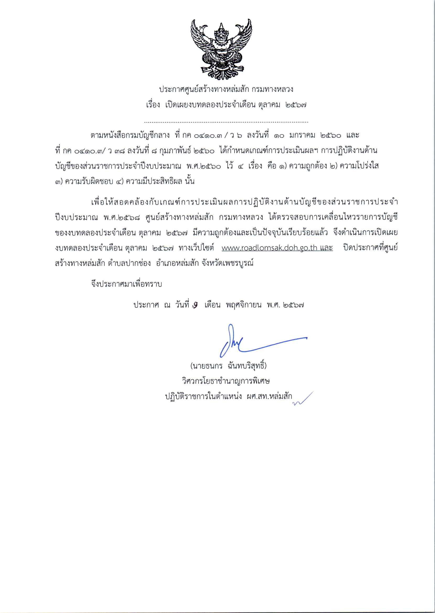 ประกาศเปิดเผยงบทดลองประจำเดือน ตุลาคม 2567 ปีงบประมาณ 2568