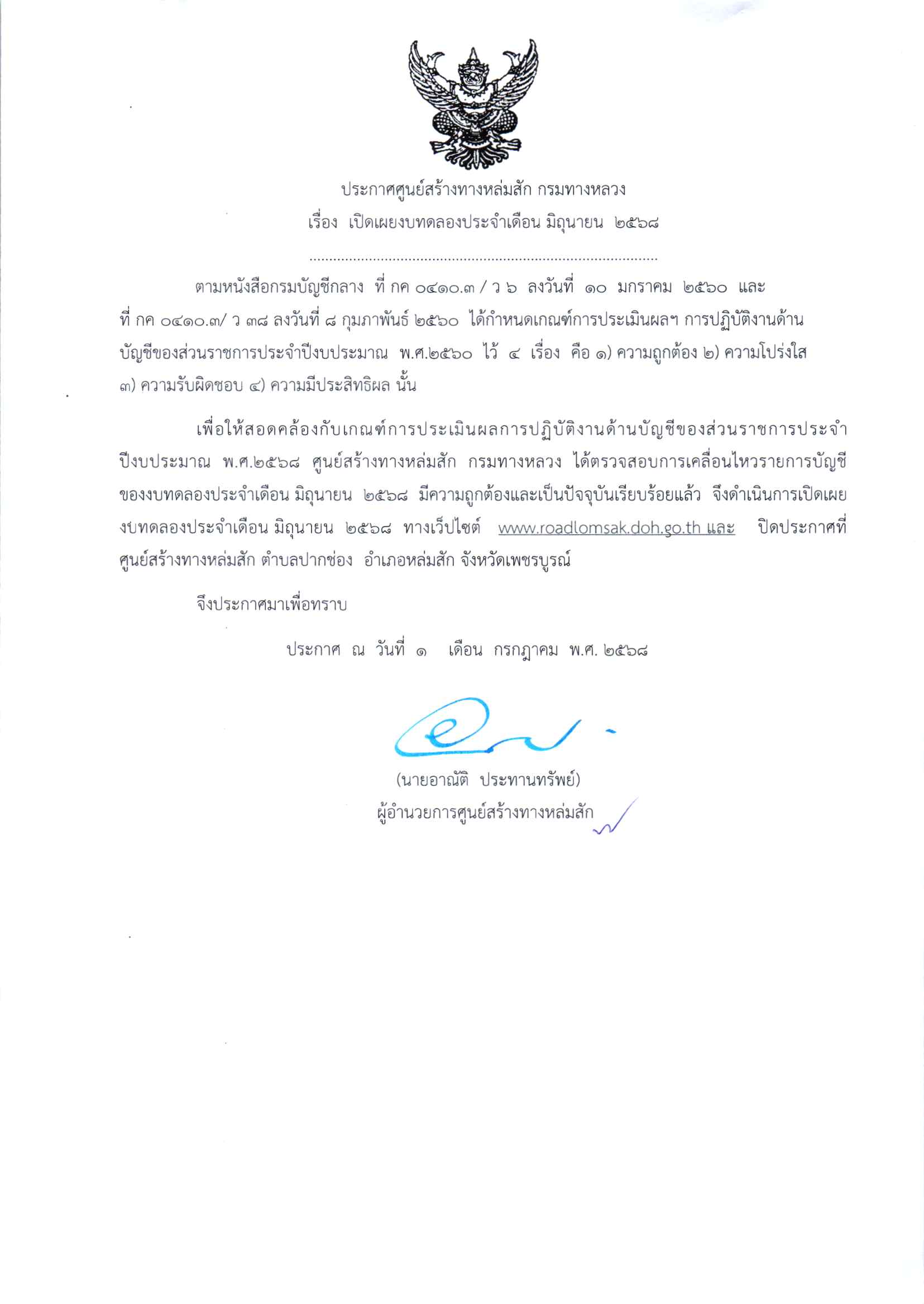 ประกาศเปิดเผยงบทดลองประจำเดือน มิถุนายน 2568 ปีงบประมาณ 2568